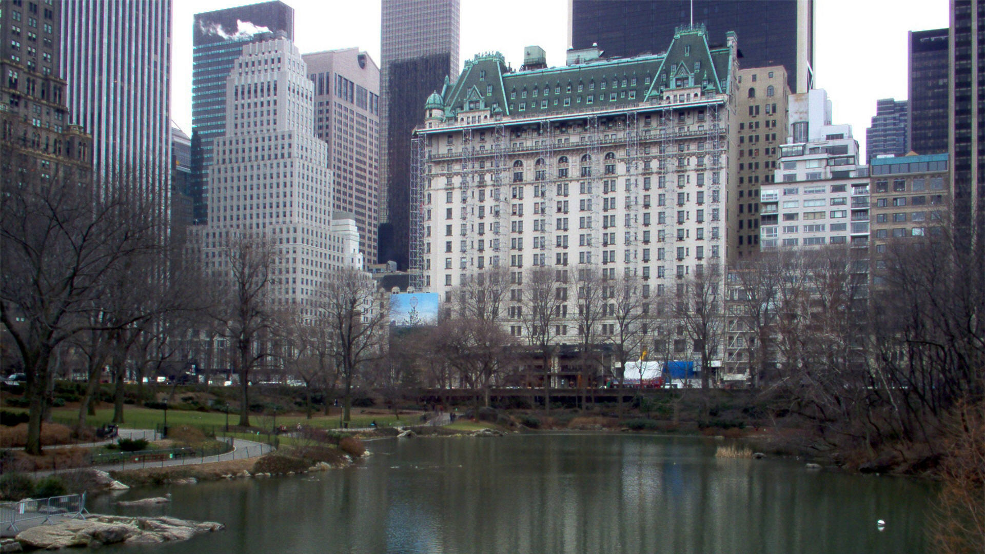 Description: A pond in a city park surrounded by tall buildings and trees with no leaves on them and a bridge in the middle.