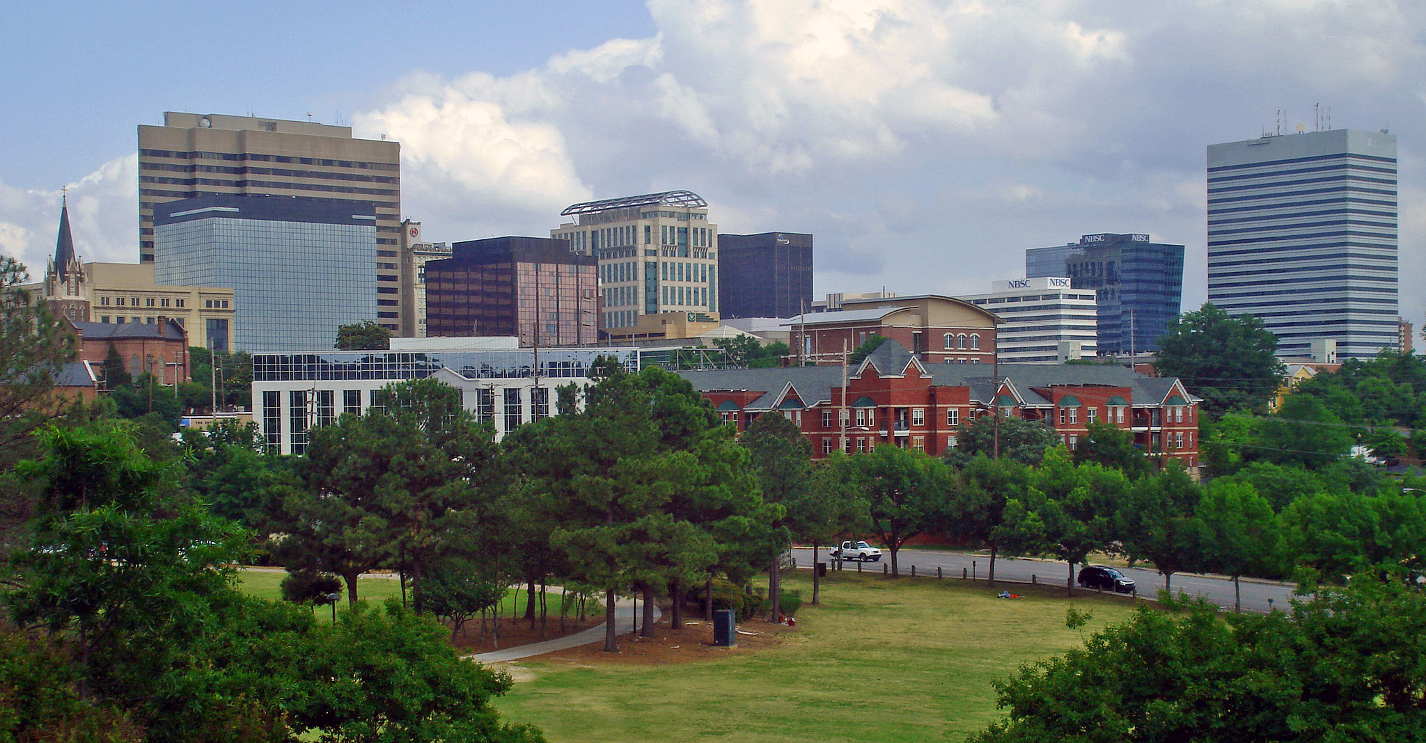Description: A city with a lot of tall buildings and trees in the foreground and a park in the foreground.