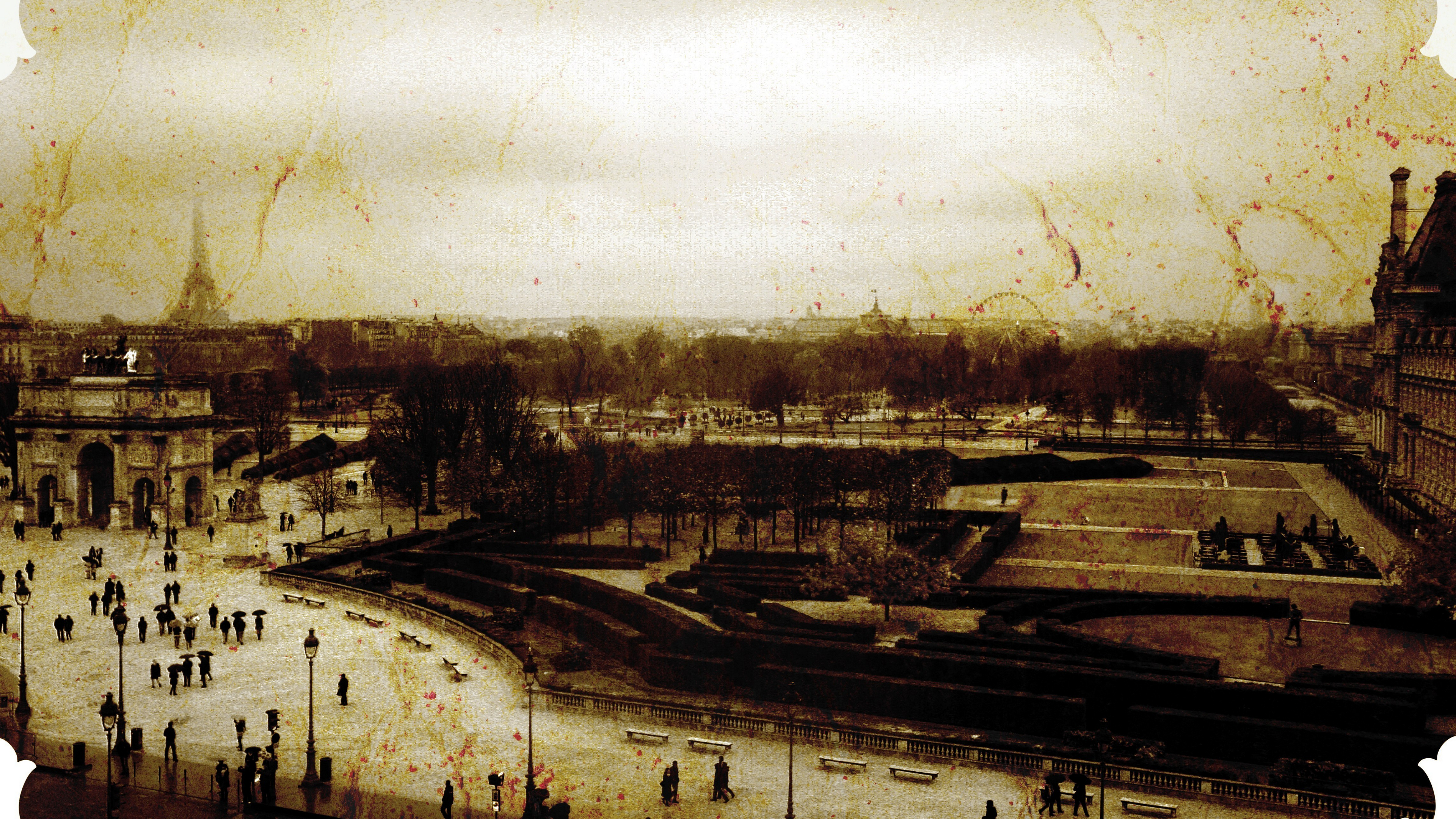 Description: A picture of a city with people walking around it and a clock tower in the background with a cloudy sky.
