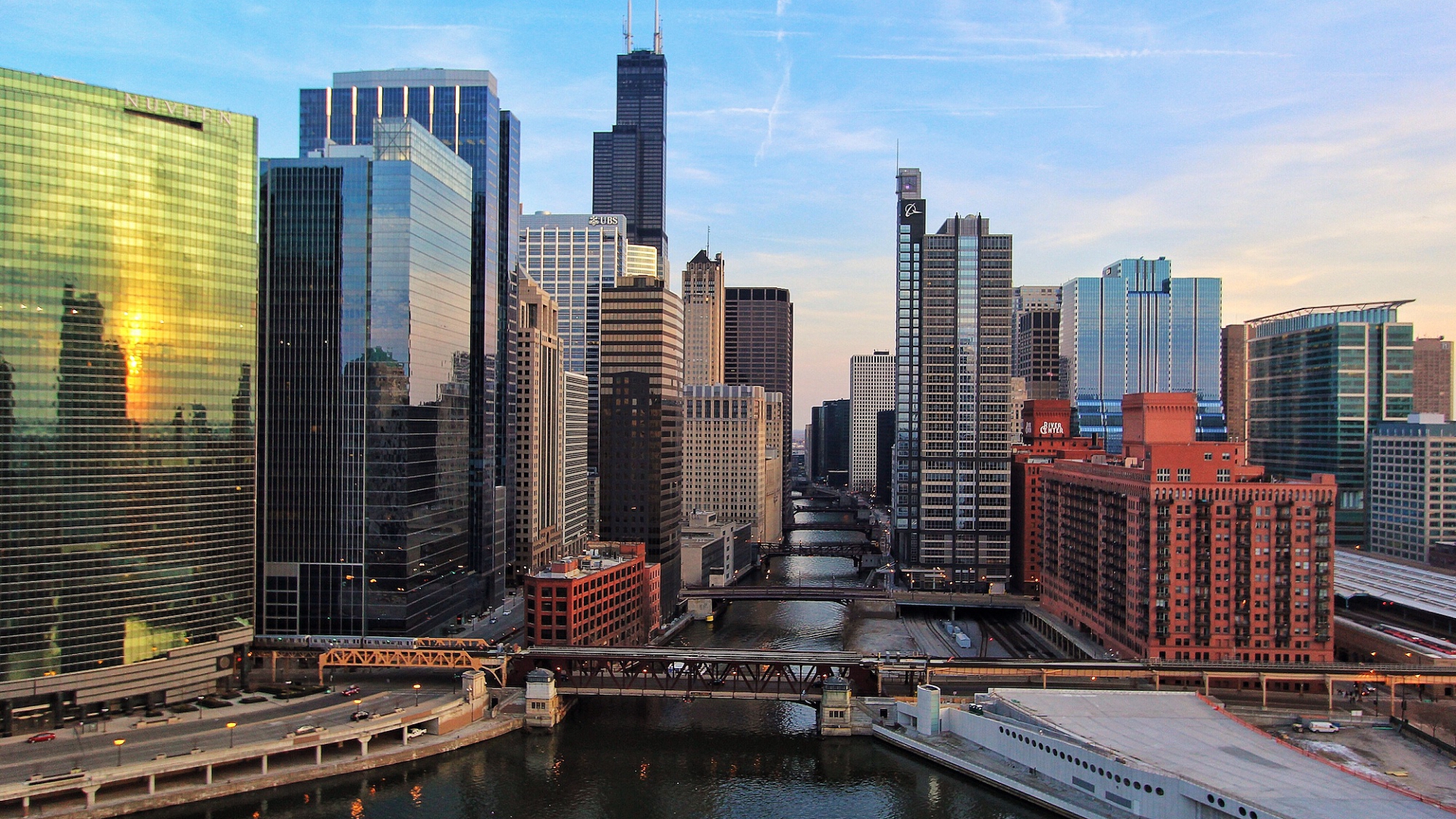 Description: A city with a river running through it and a bridge crossing over it with a train on the other side.