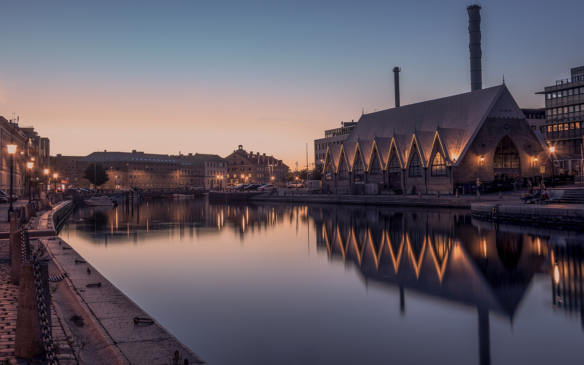 Description: A city with a river and a building with a clock tower in the background at dusk with lights on.