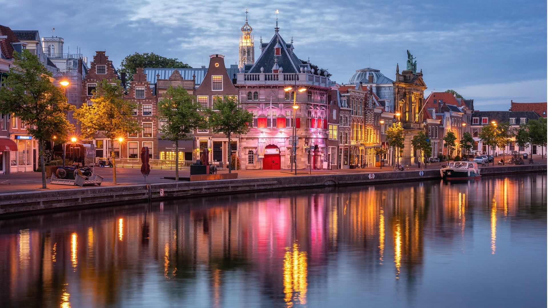Description: A city with a river and a few buildings on the side of it at night time with lights on.
