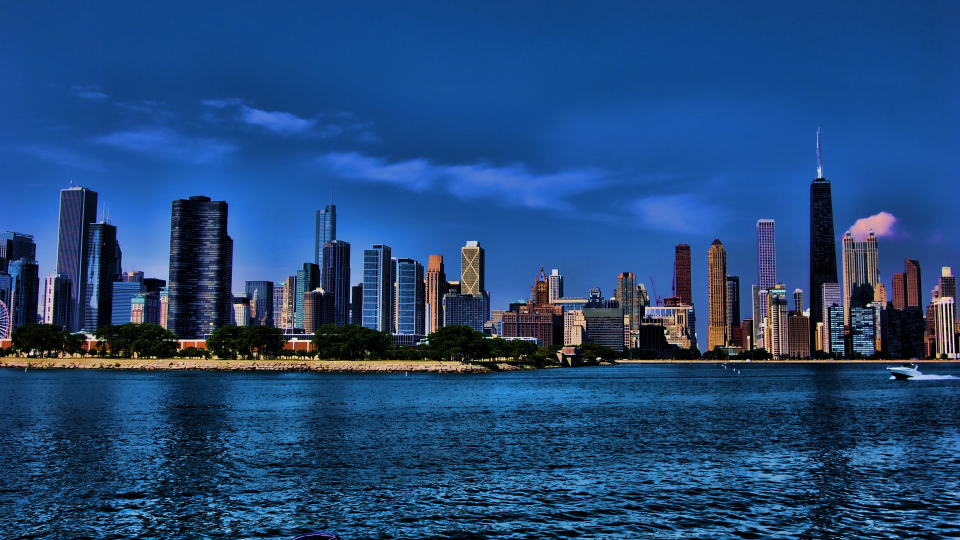 Description: A city skyline with a boat in the water and a boat in the foreground with a boat in the foreground.