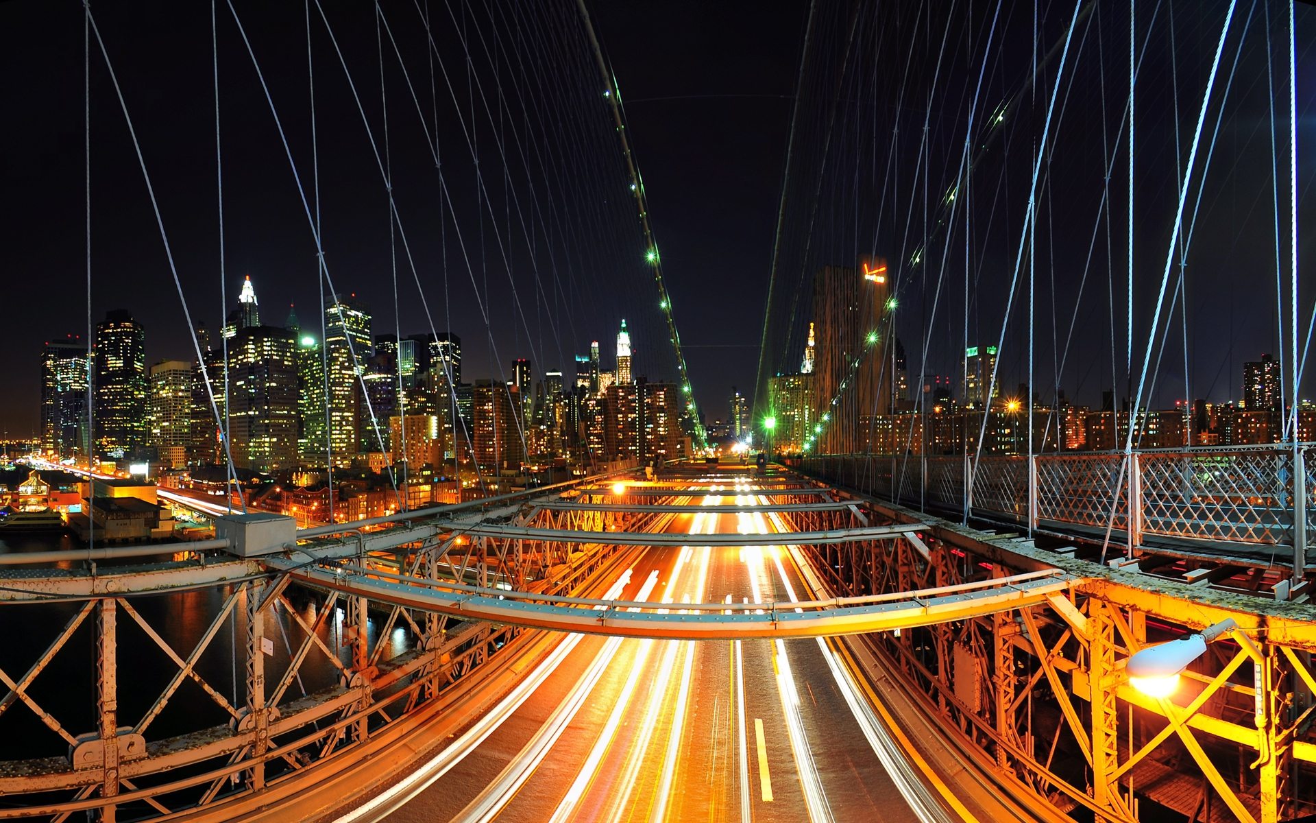 Description: A city skyline with a bridge and a highway at night with lights streaking down the sides of the bridge.