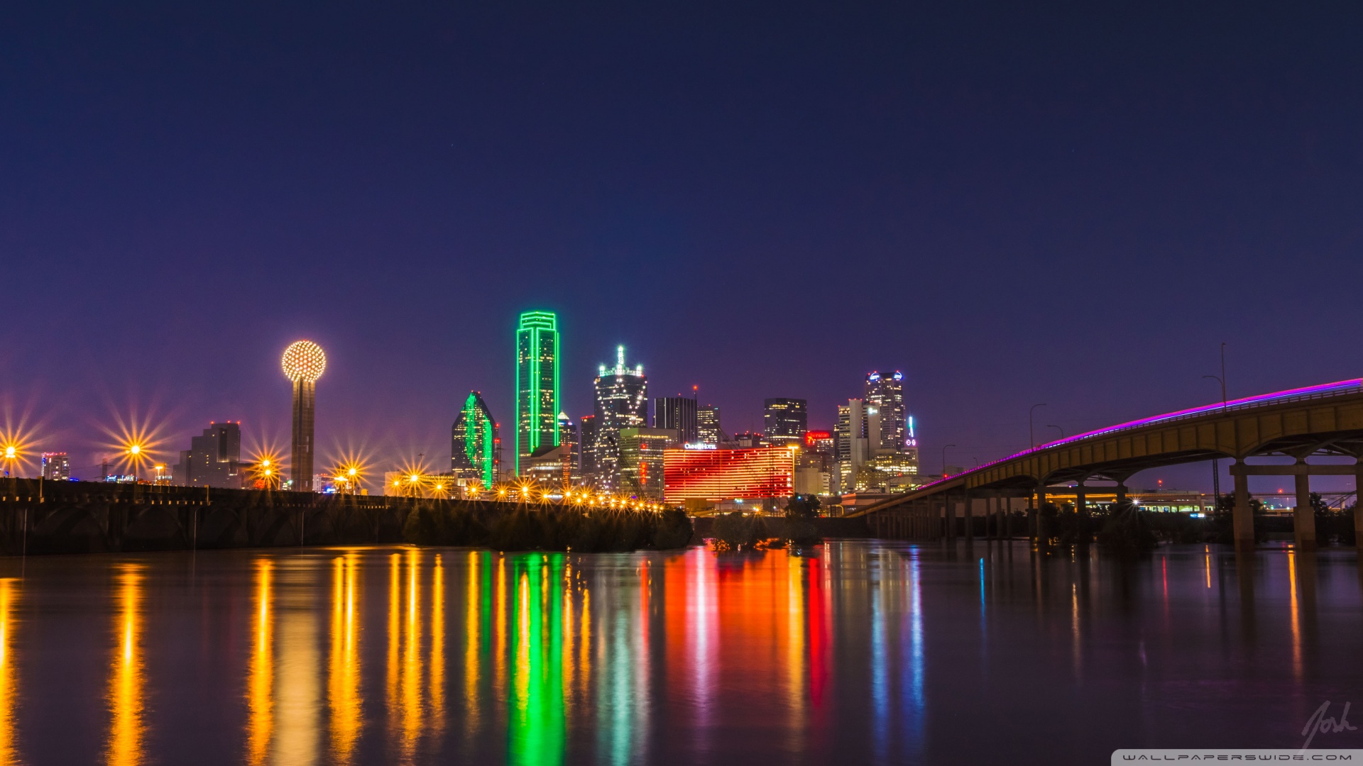Description: A city skyline with a bridge and lights reflecting in the water at night time with a bright light on the buildings.