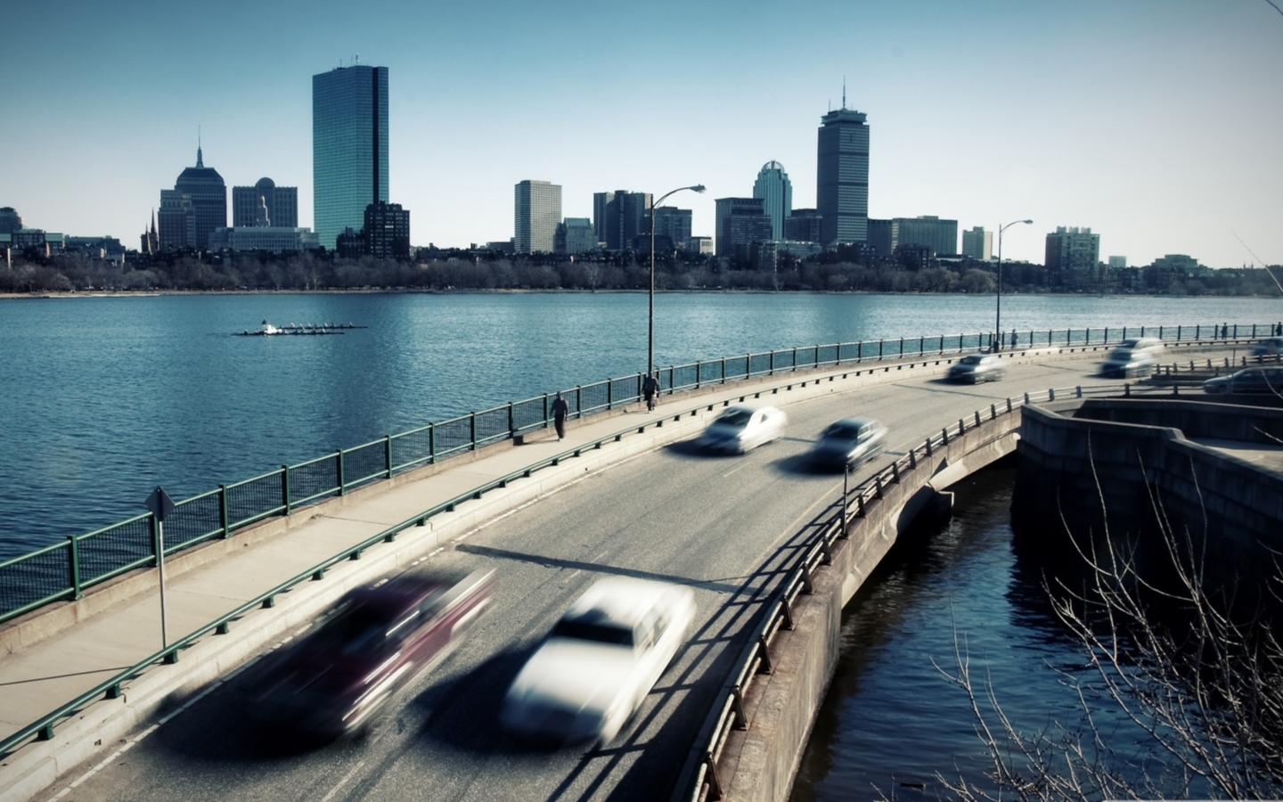 Description: A city skyline with a bridge and a river with cars driving on it and a boat in the water.