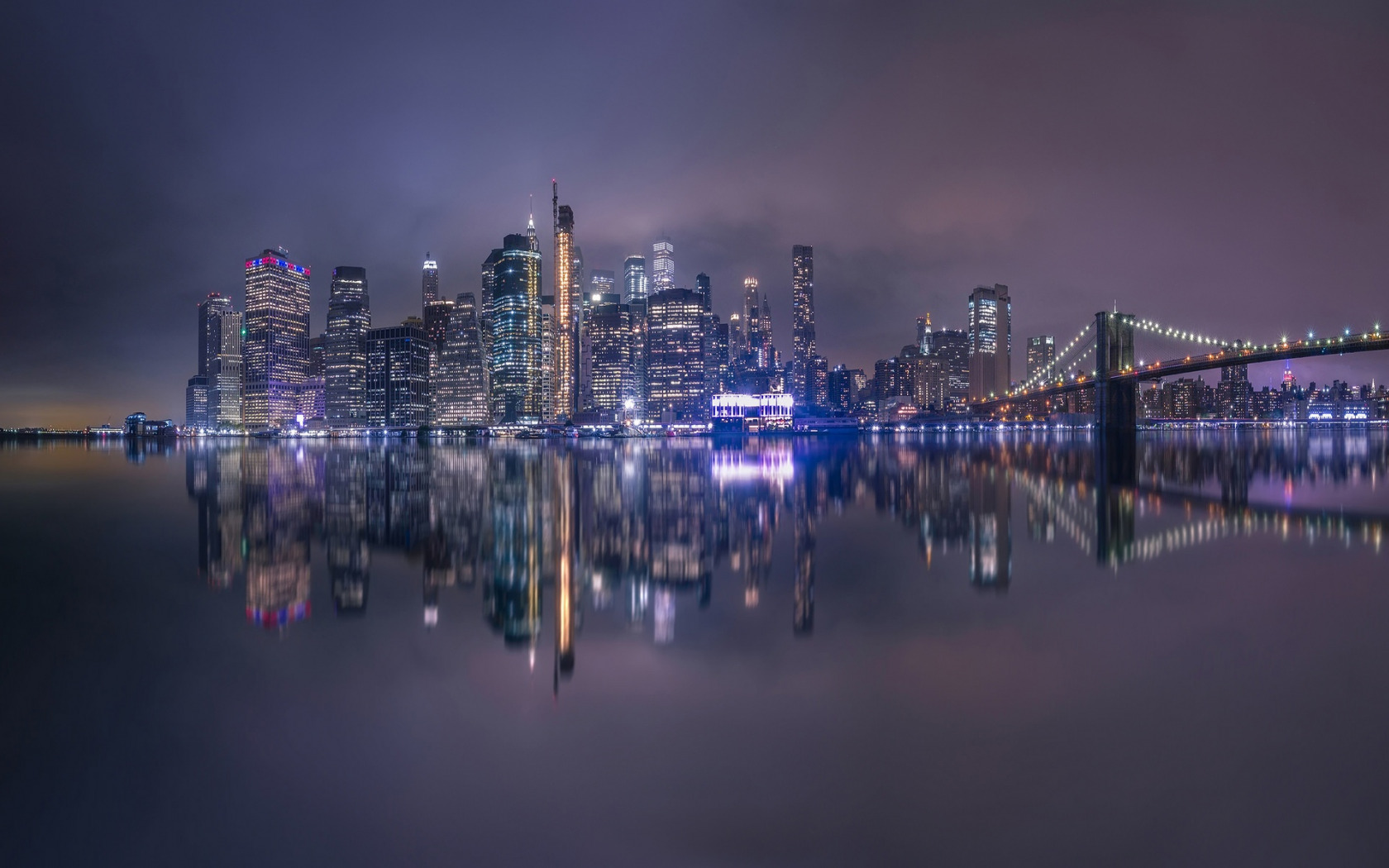Description: A city skyline with a bridge and a river at night with lights reflecting in the water and a bridge in the foreground.