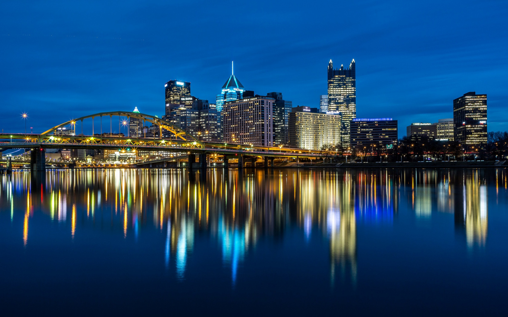 Description: A city skyline with a bridge over a river at night with lights reflecting off the water and a bridge in the foreground.