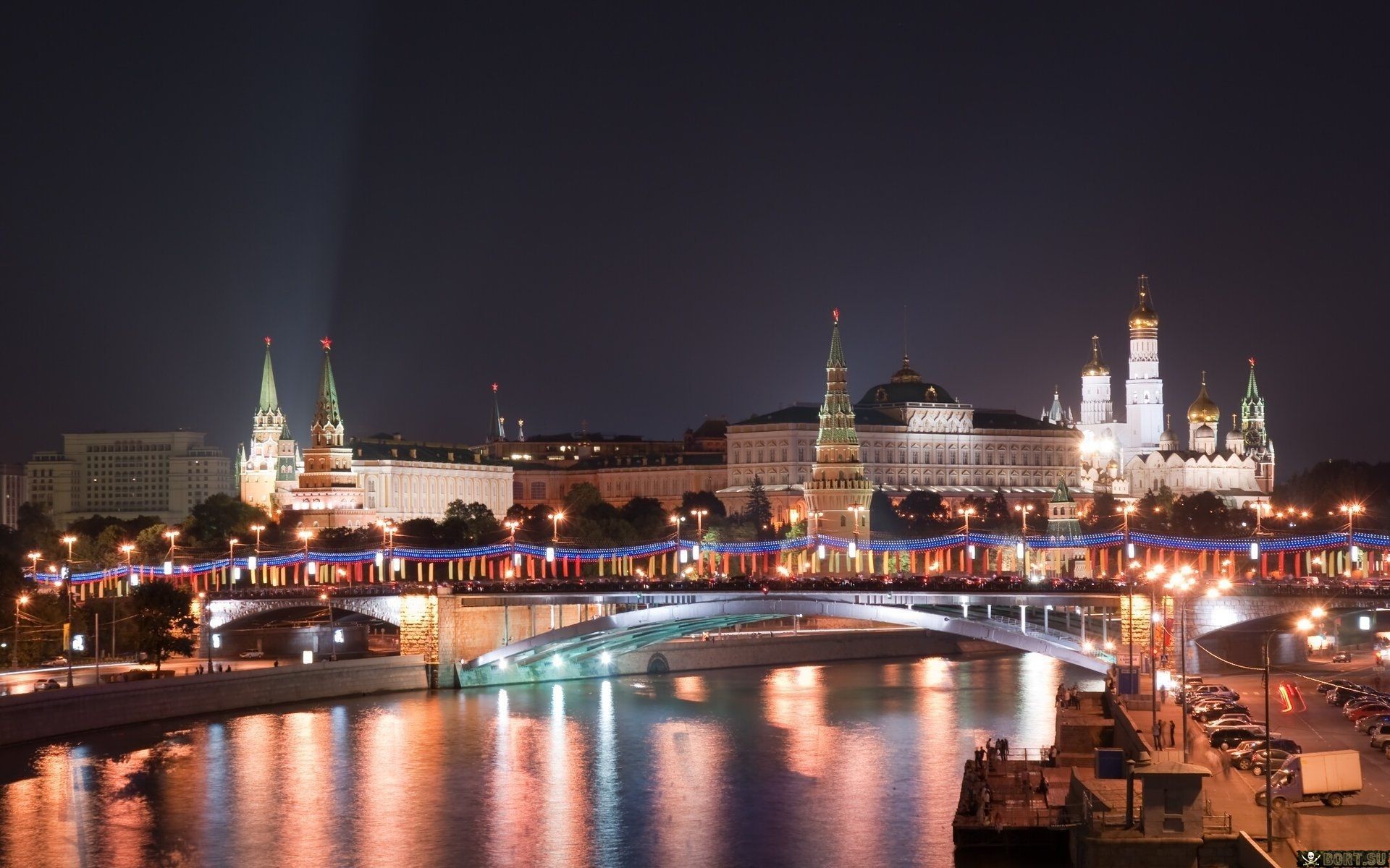 Description: A city skyline with a bridge over a river at night with lights on it and a bridge over the water.