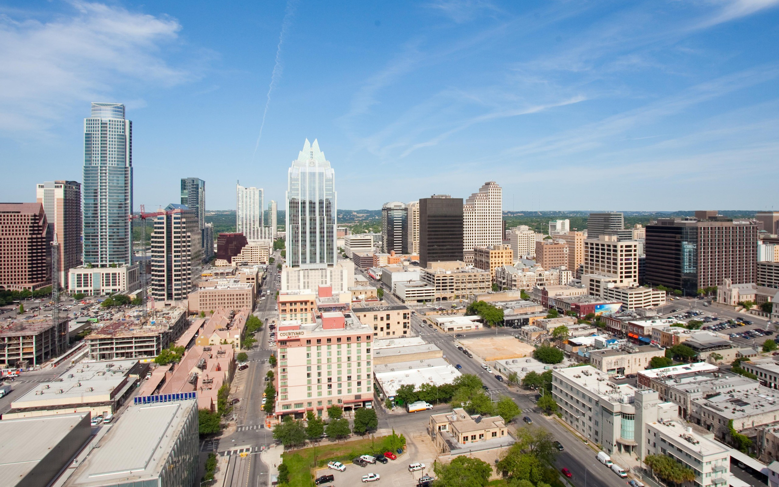 Description: A city with tall buildings and a blue sky in the background with a few clouds in the sky above.