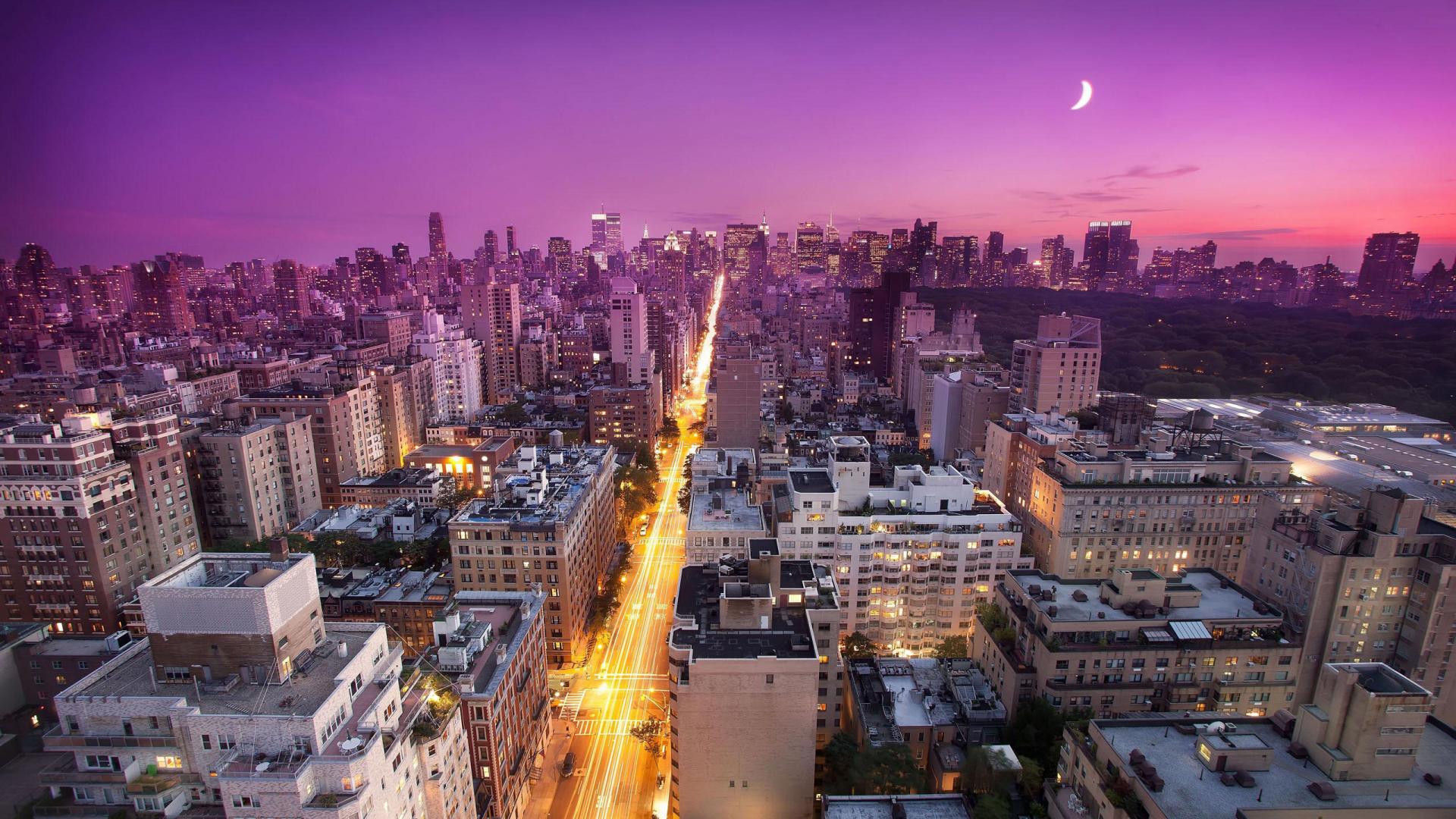 Description: A city skyline with a street light at dusk with a crescent of lights in the sky and buildings in the foreground.