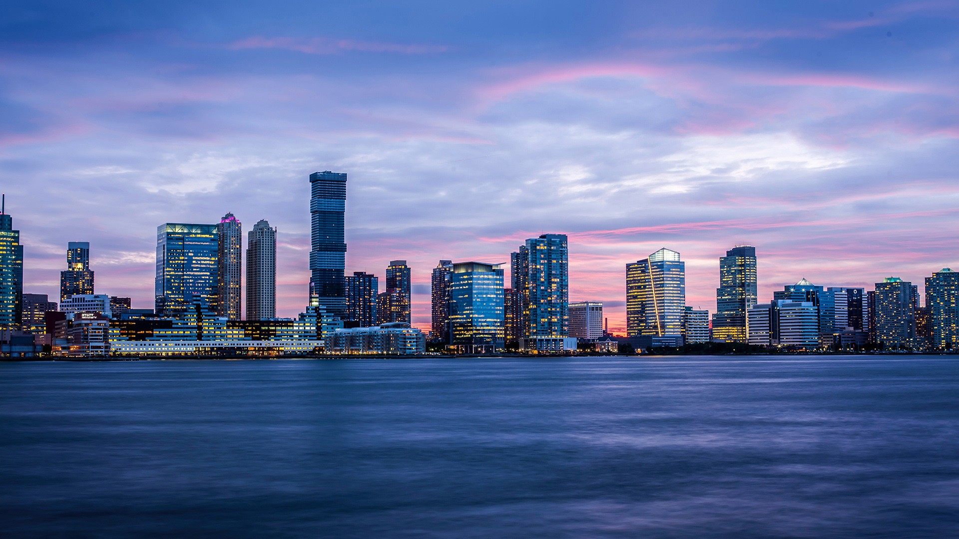 Description: A city skyline with a body of water in front of it at dusk with a pink and blue sky.
