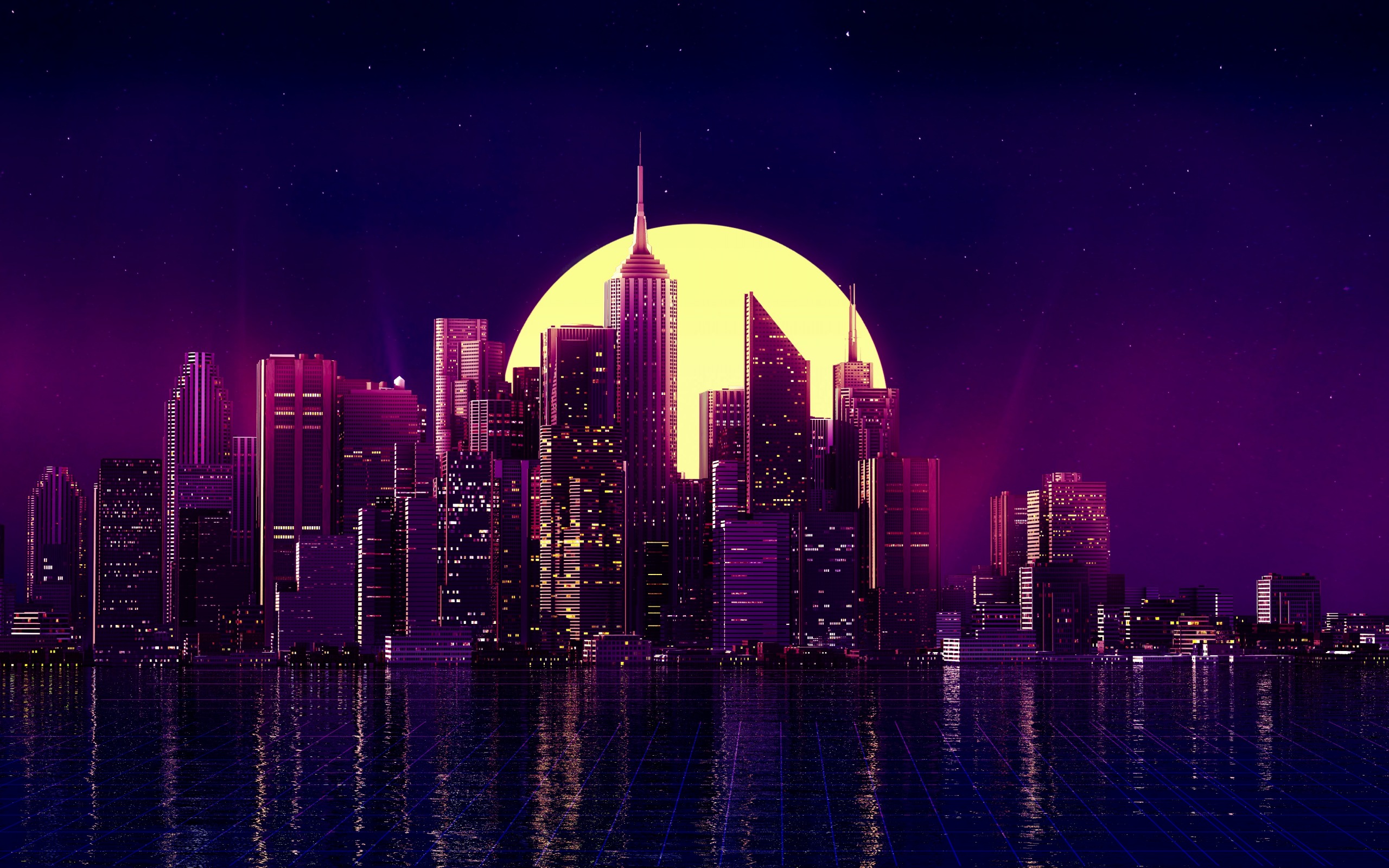 Description: A city skyline with a full moon in the background and a purple sky with a few clouds and a few stars.