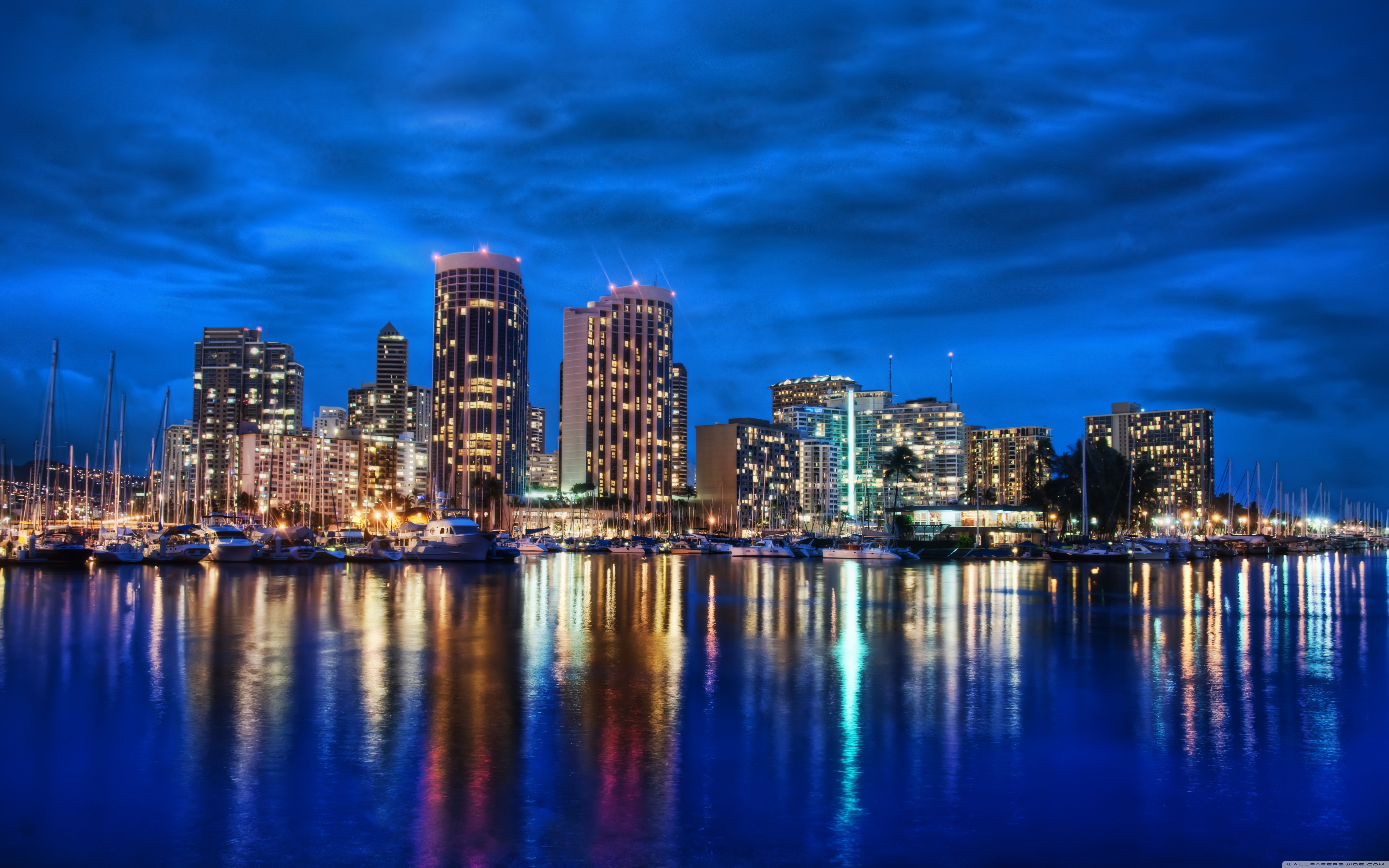 Description: A city skyline with a harbor and boats at night time with a blue sky and clouds reflected in the water.