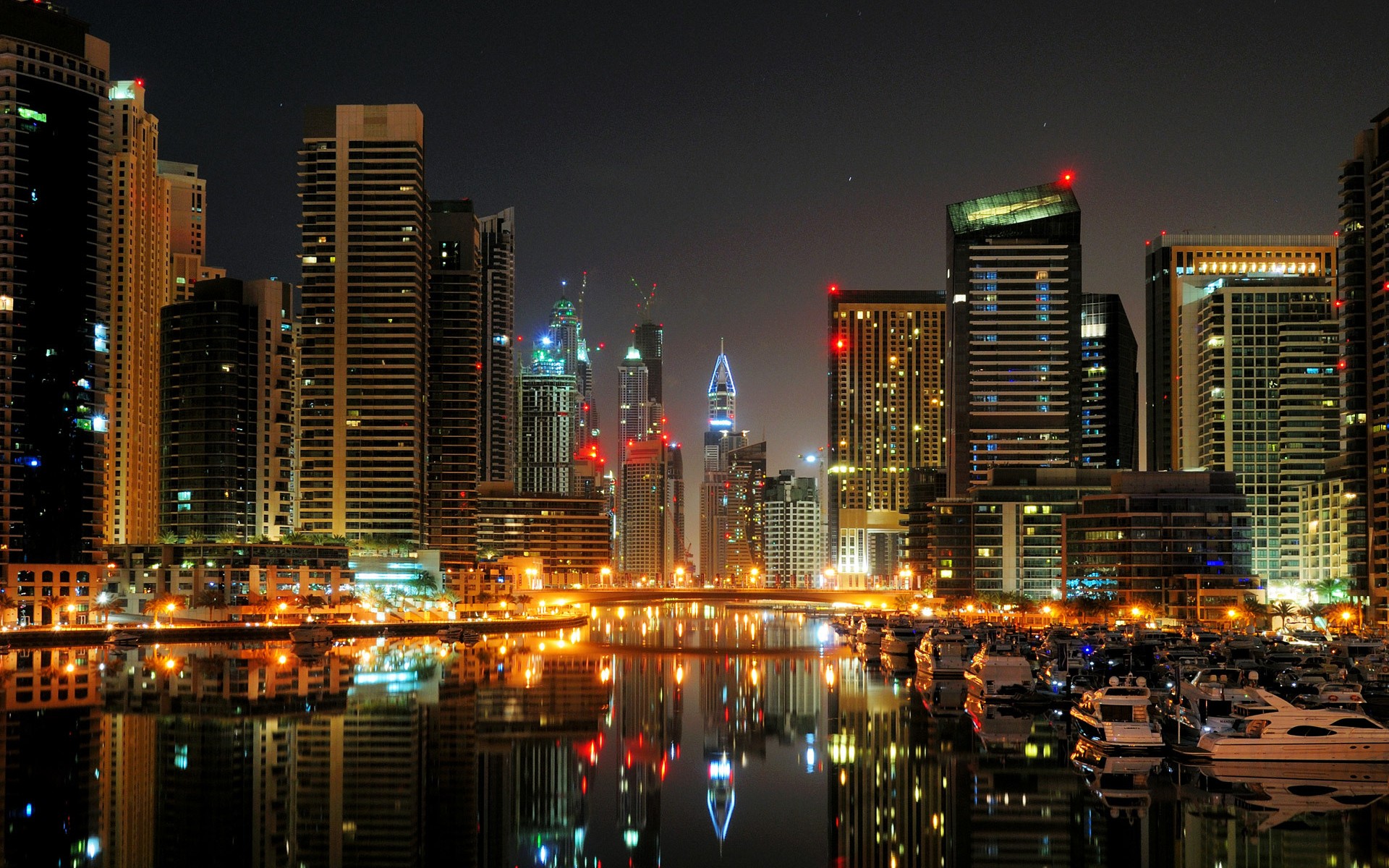 Description: A city skyline with a harbor and boats at night time with lights on the buildings and the water reflecting off the water.