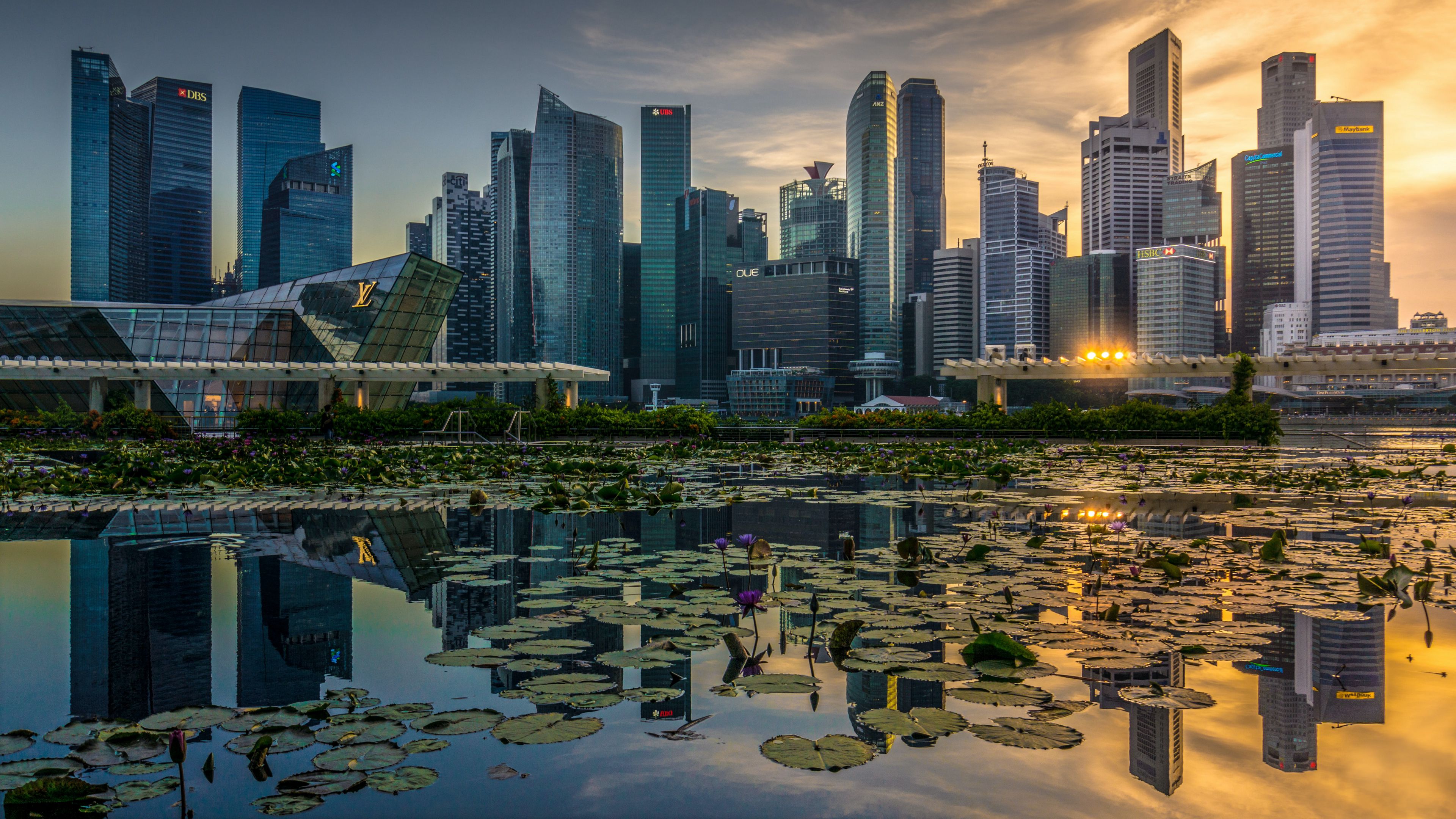 Description: A city skyline with a lake and lily pads in the foreground and a sunset in the background with a yellow sky.