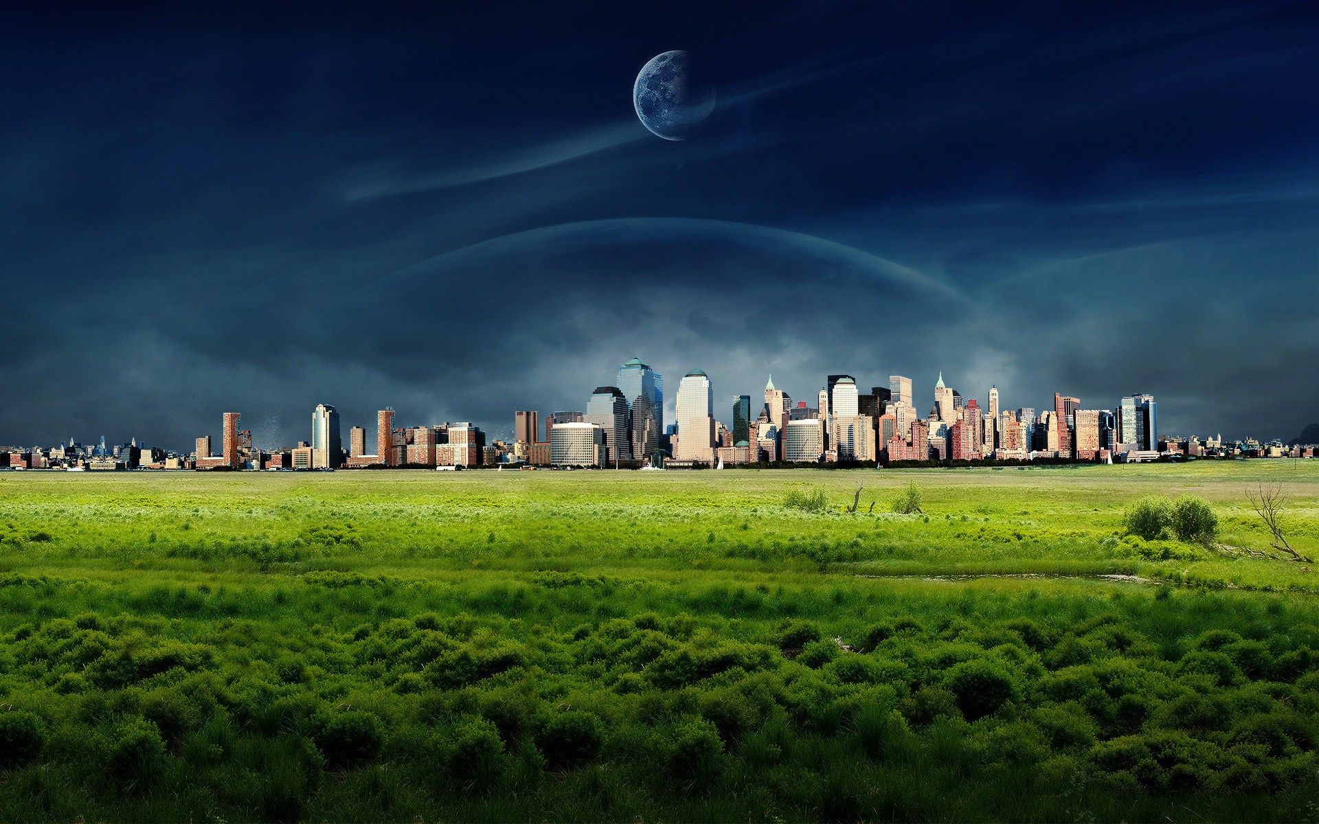 Description: A city skyline with a moon in the sky and a green field in front of it with a dark sky.