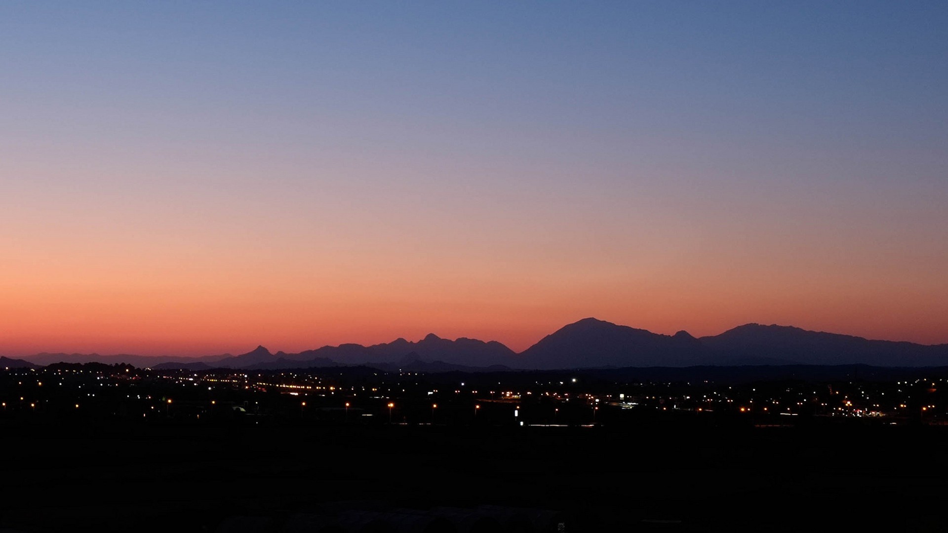 Description: A city skyline with a few mountains in the distance at sunset or dawn with a few clouds in the sky.