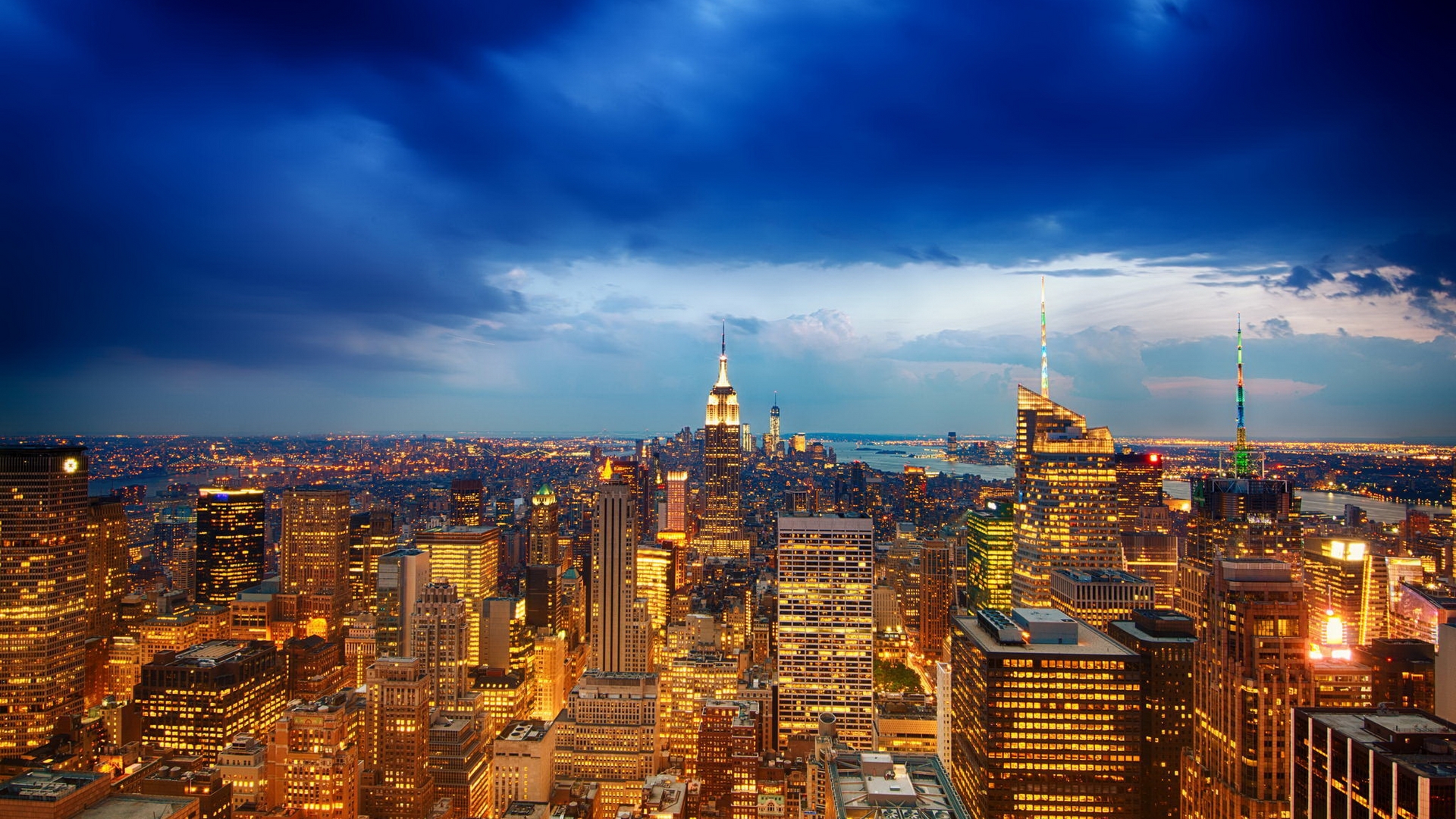 Description: A city skyline at night with a dark sky and clouds above it and a few lights on the buildings.