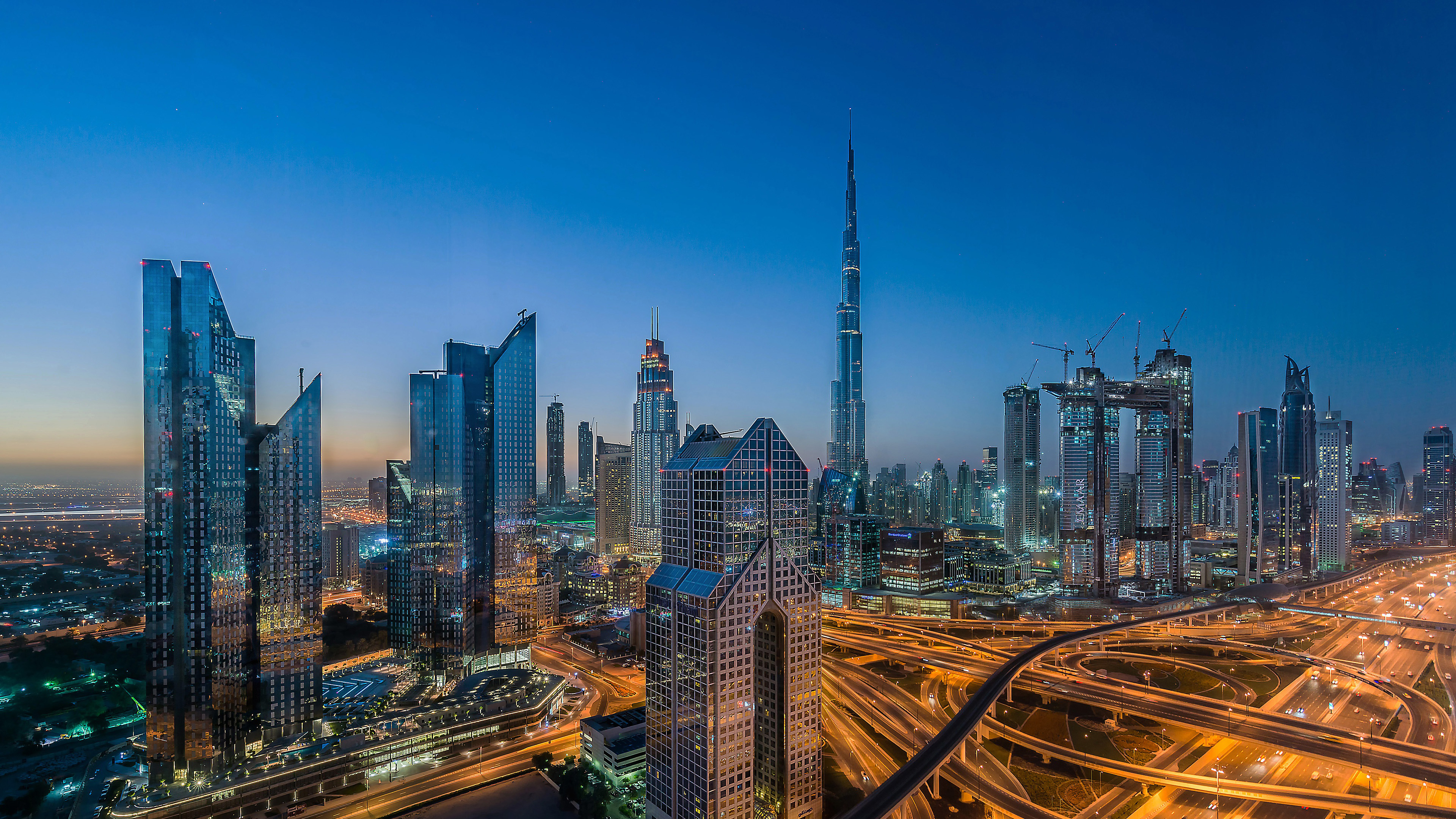 Description: A city skyline with a lot of tall buildings and a highway at night time with lights on and a blue sky.