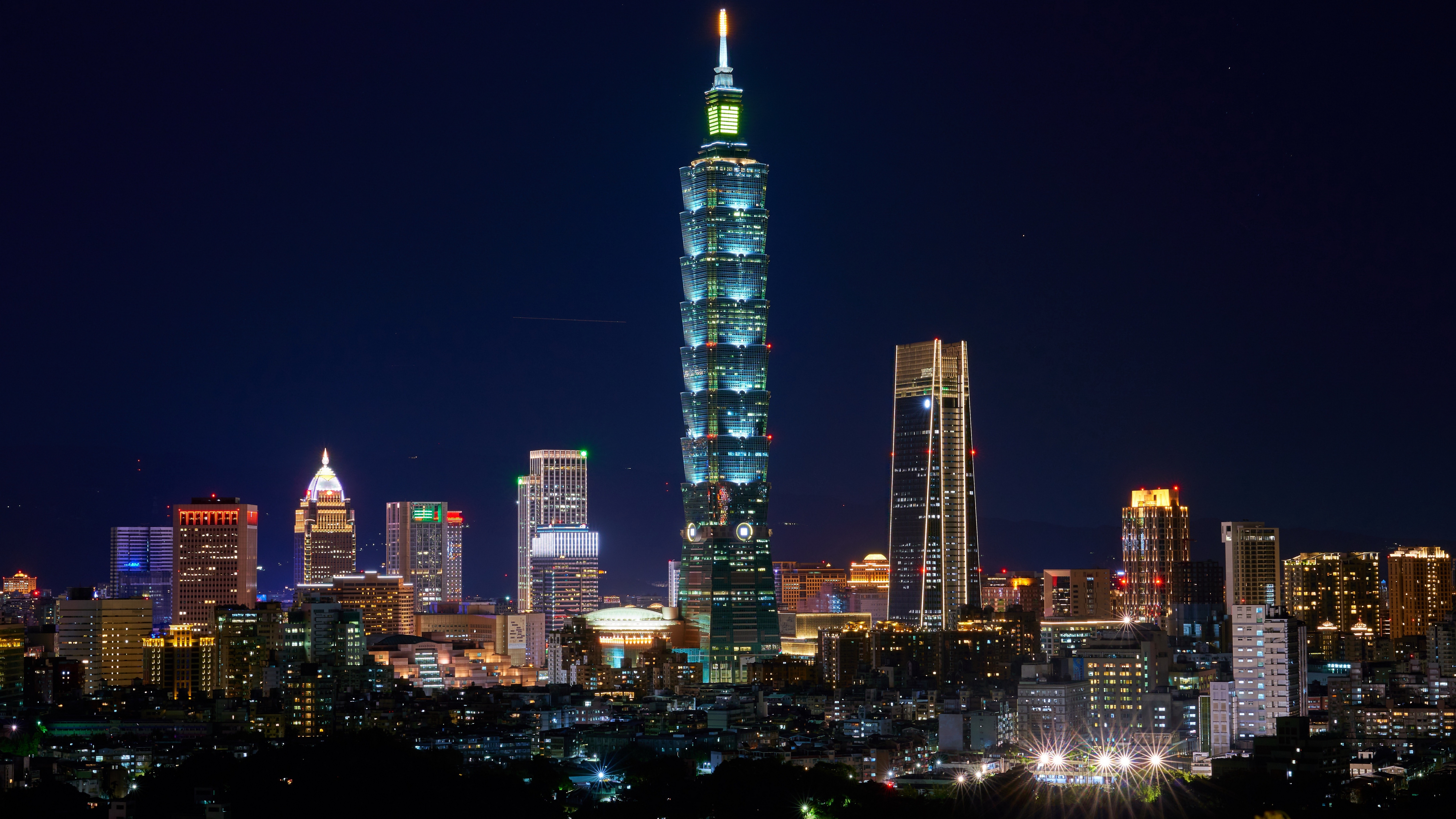 Description: A city skyline at night with a very tall building lit up in the sky and lights on the buildings.