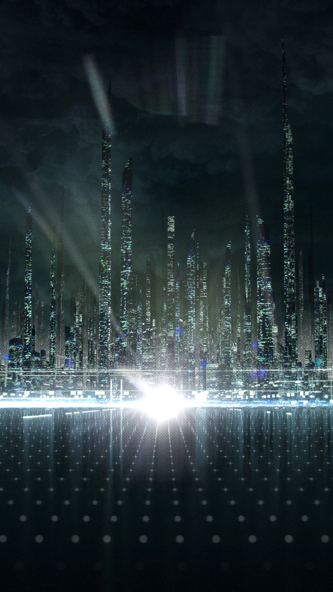 Description: A city skyline with a bright light shining through the clouds and reflecting on the water at night time with a bright light shining through the clouds.