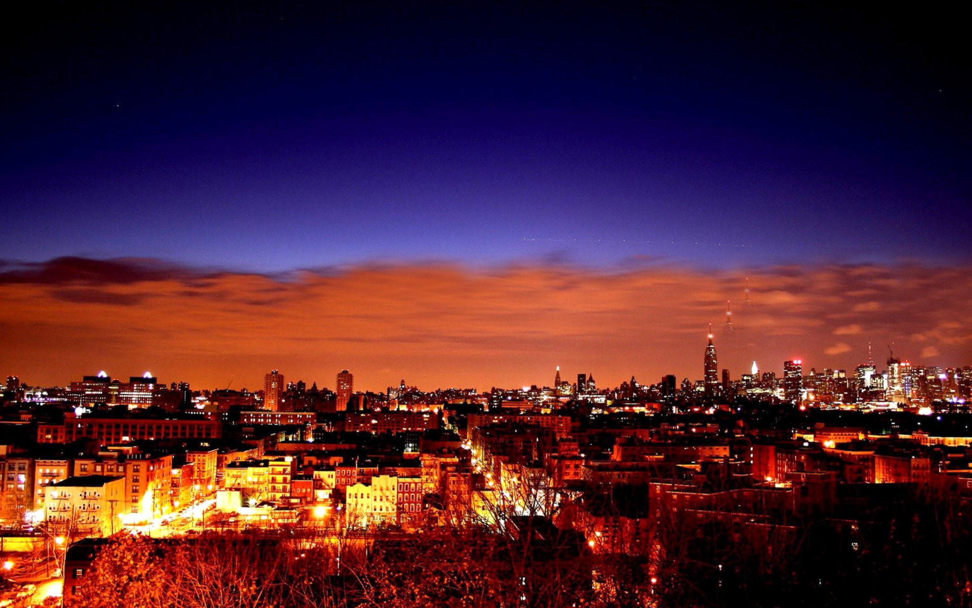 Description: A city skyline at night with a red sky and clouds in the background and a few buildings lit up.
