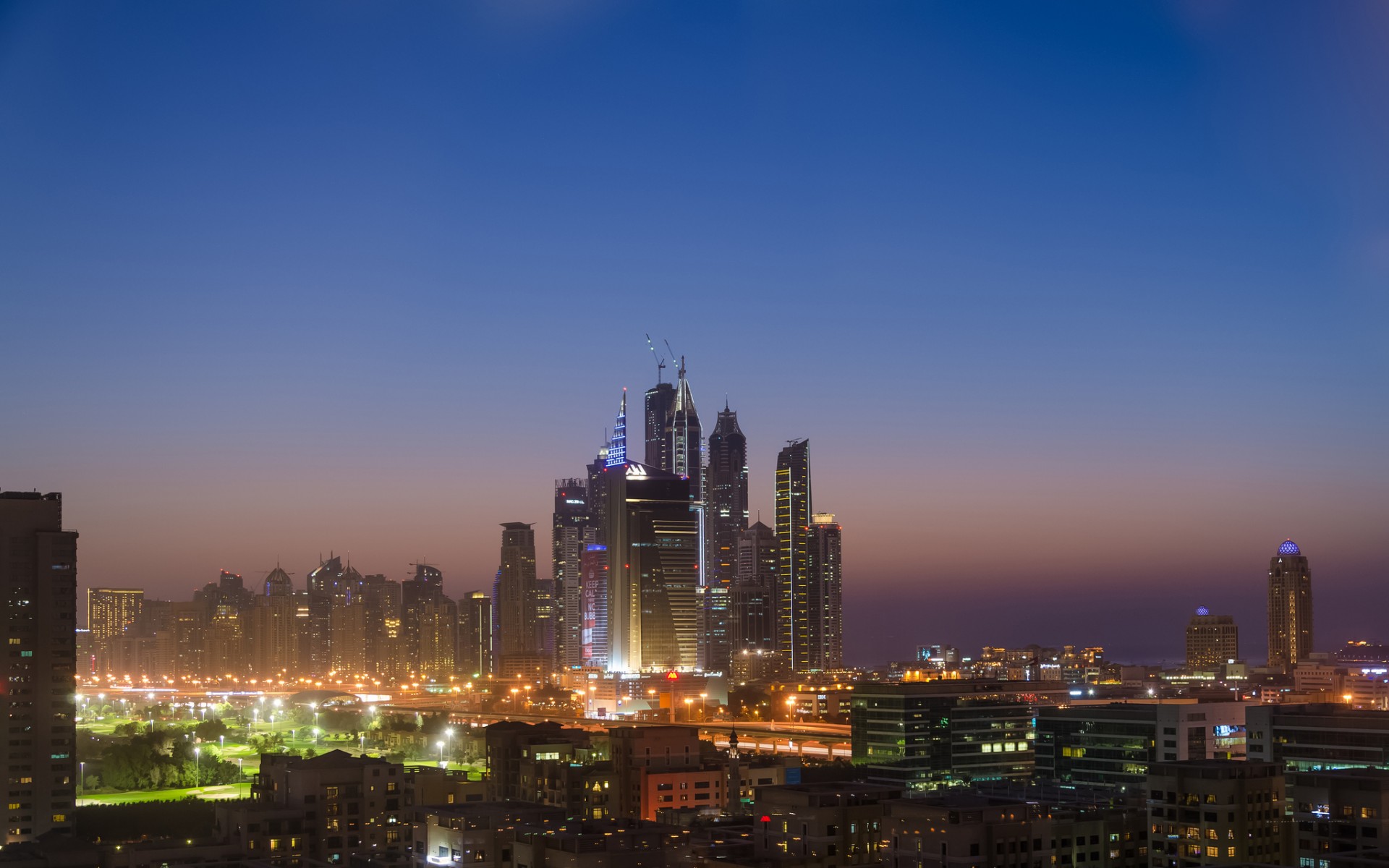 Description: A city skyline at night with a lot of tall buildings in the background and a blue sky with a few clouds.