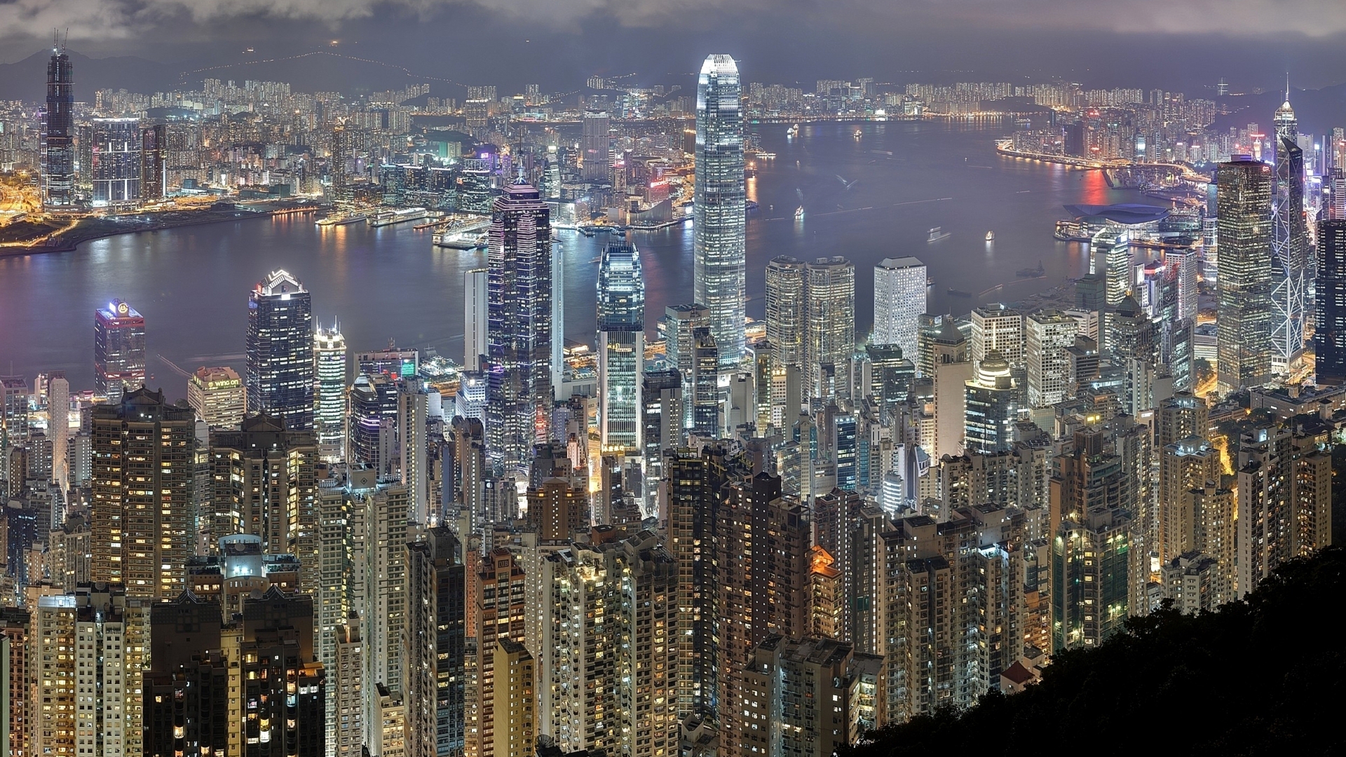 Description: A city skyline at night with a large body of water in the foreground and a large city in the background.