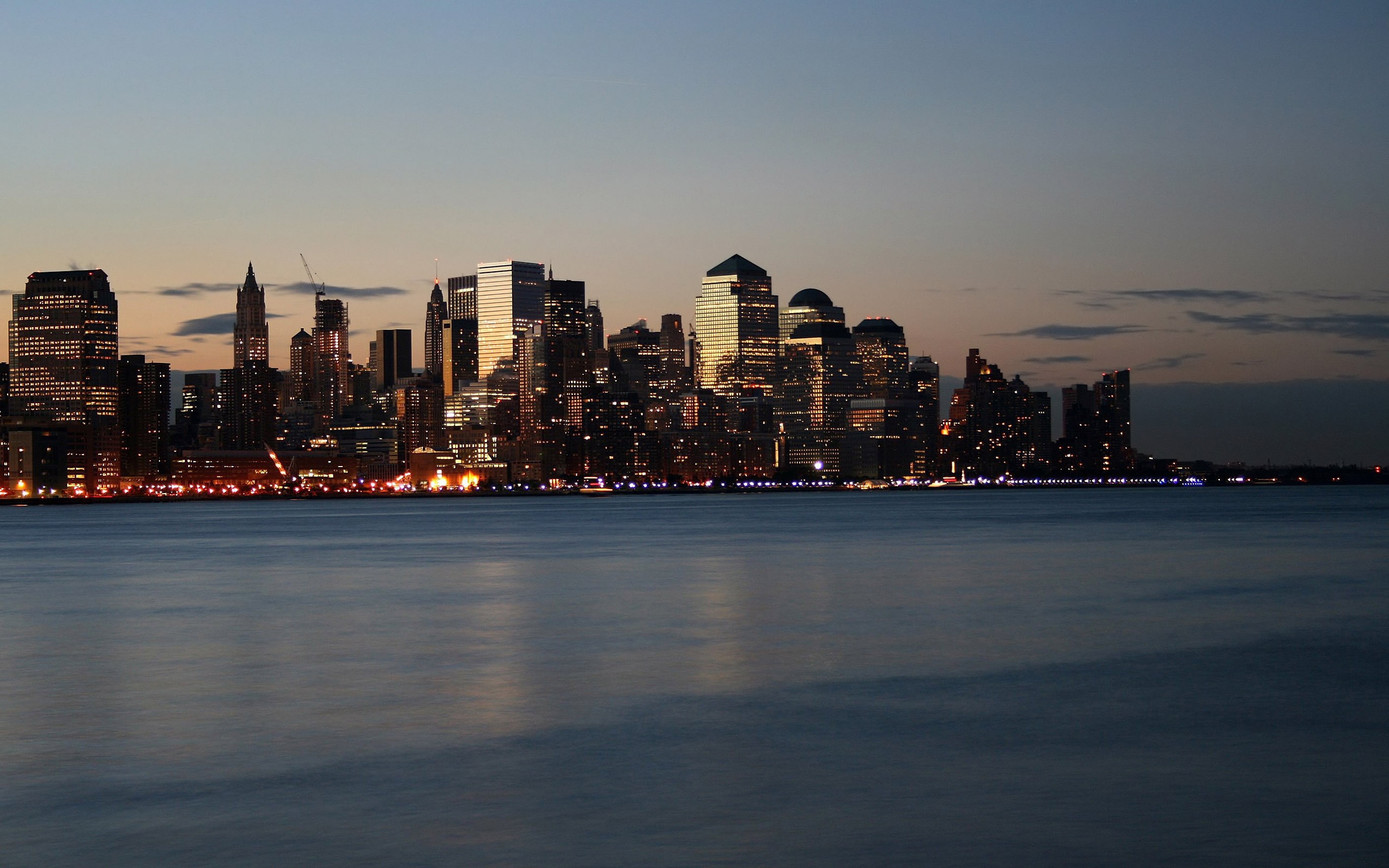 Description: A city skyline at night with a body of water in front of it and a few clouds in the sky.