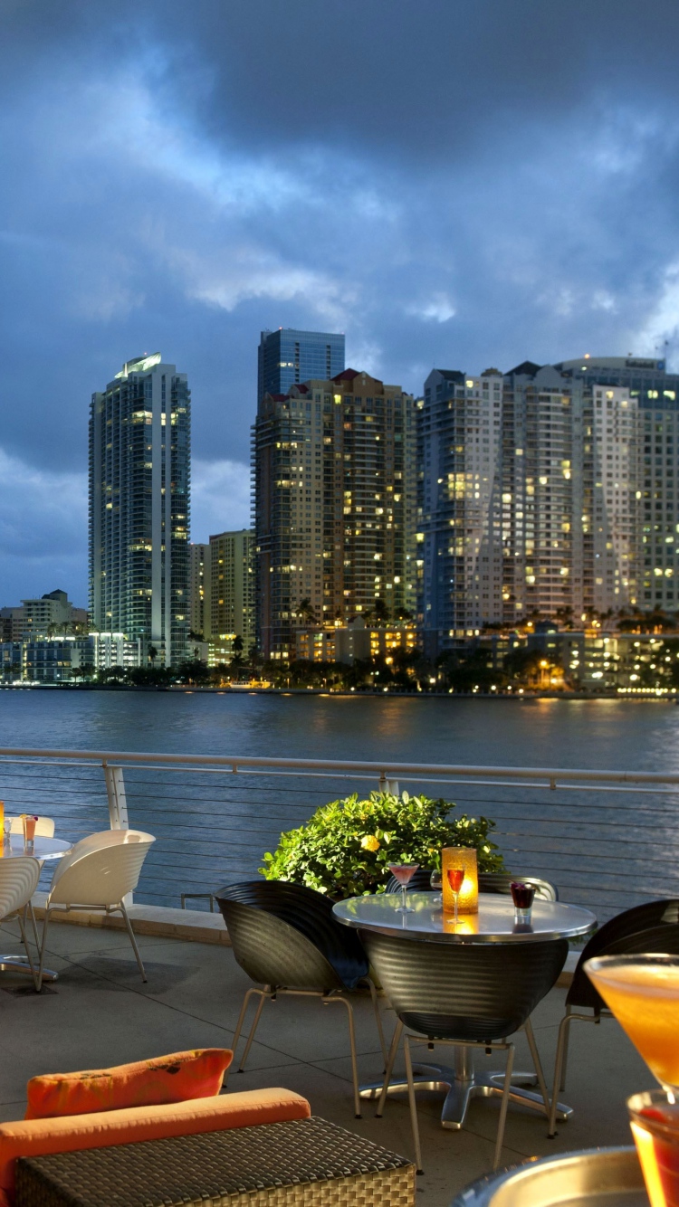 Description: A view of a city skyline from a restaurant overlooking the water at night with a table and chairs with drinks on it.