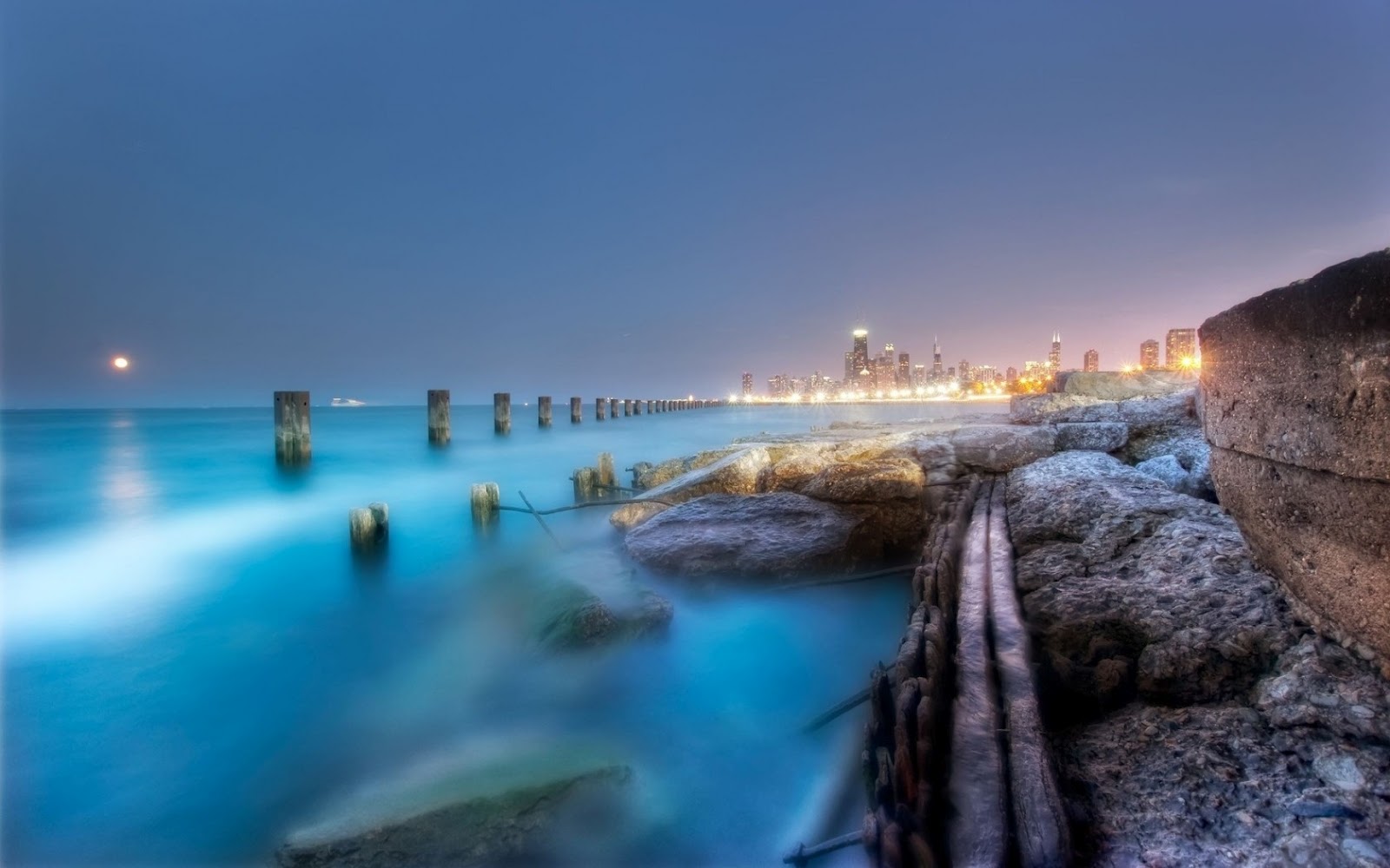 Description: A long exposure of a city skyline and the ocean at night with a long exposure of the city lights.
