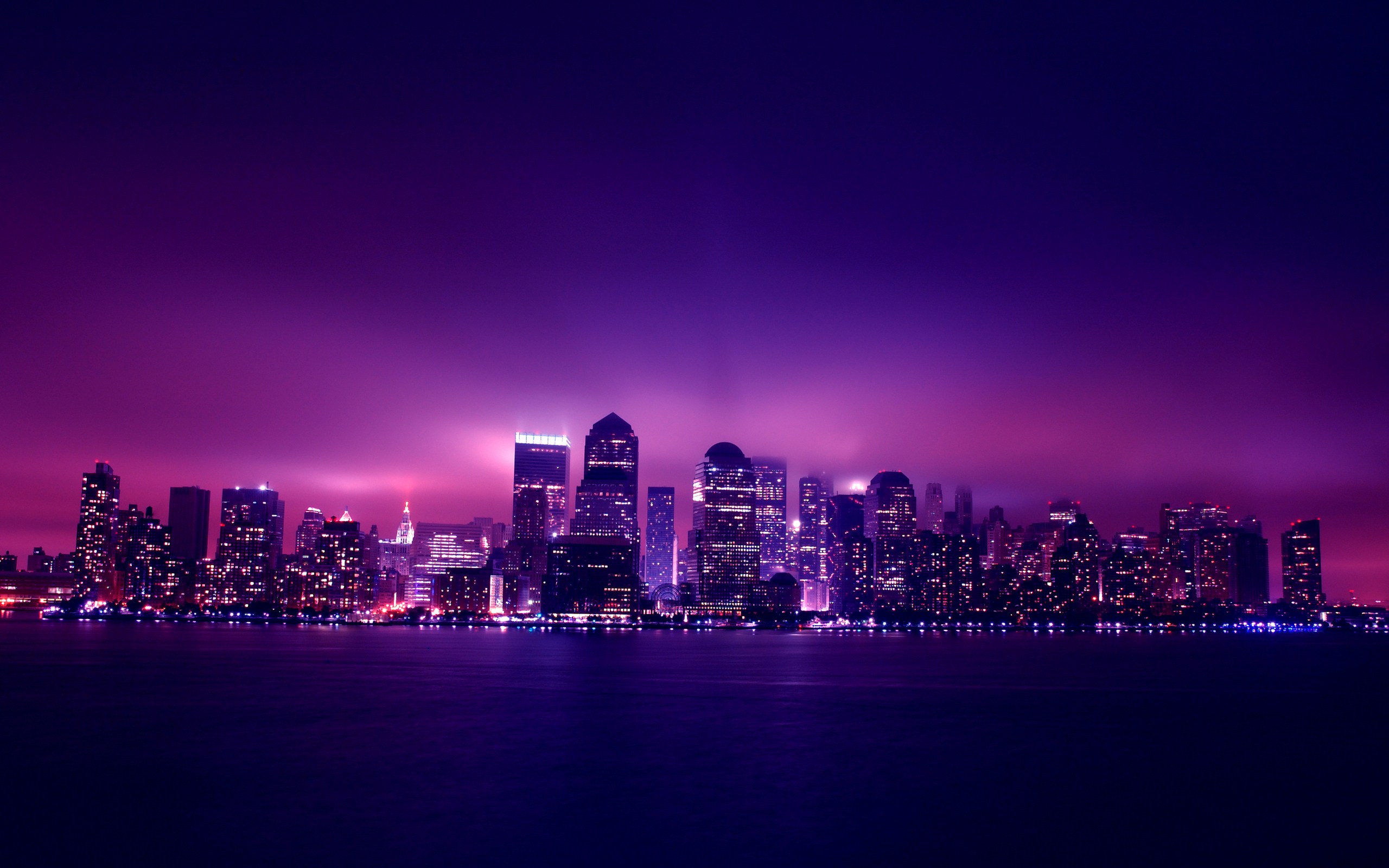 Description: A city skyline with a purple sky and water at night with lights on the buildings and the water below.