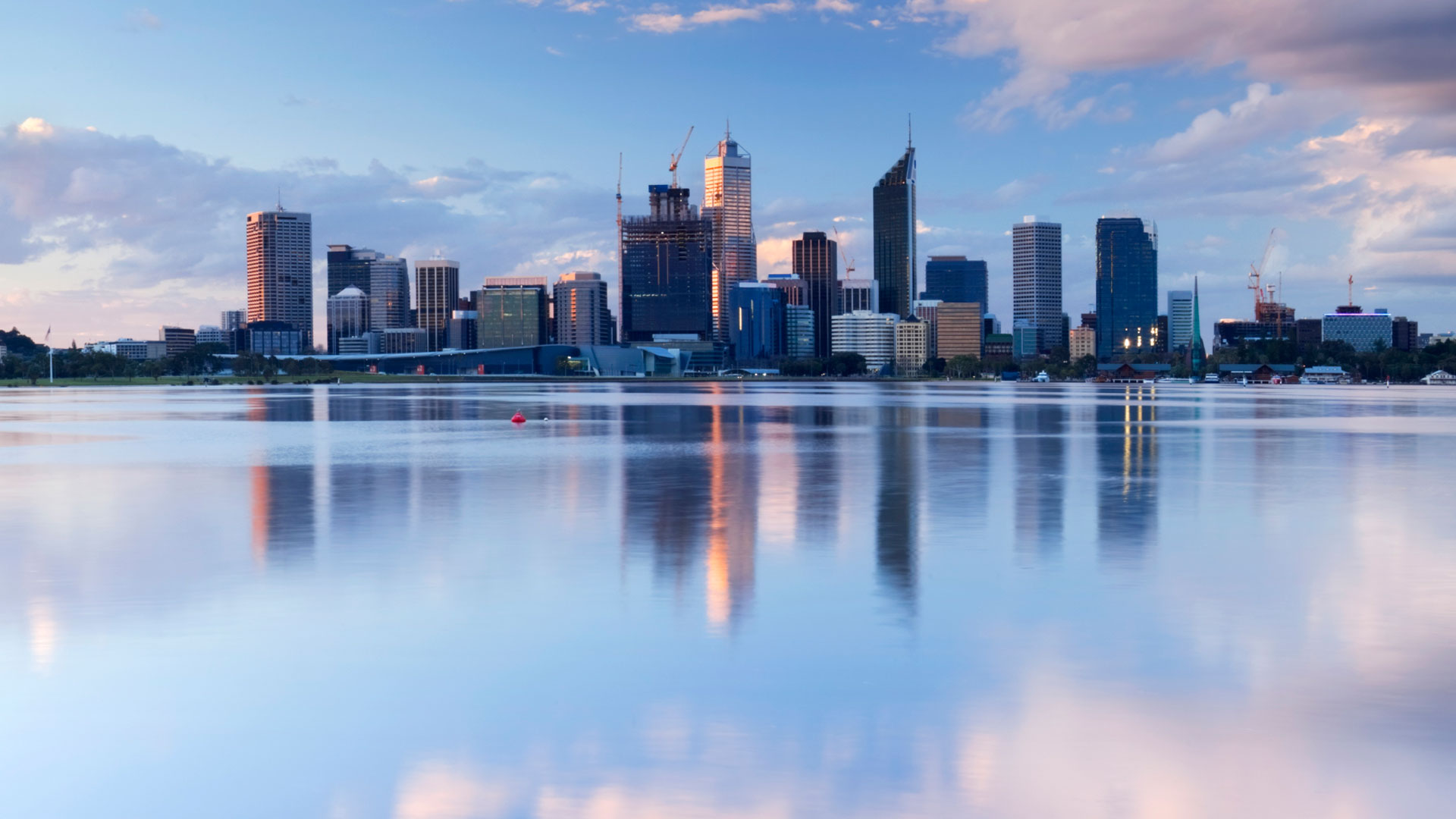 Description: A city skyline is reflected in the water of a lake with a boat in the foreground and a cloudy sky.