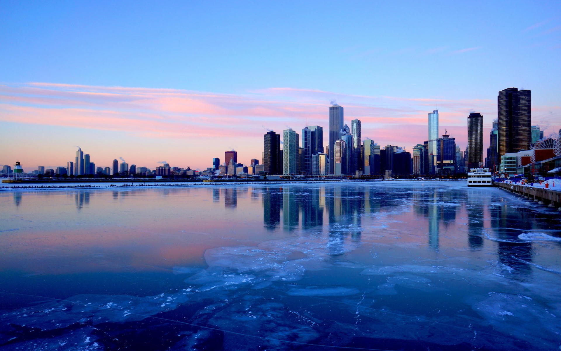 Description: A city skyline is reflected in the water of a lake at sunset or dawn with ice floes in the foreground.