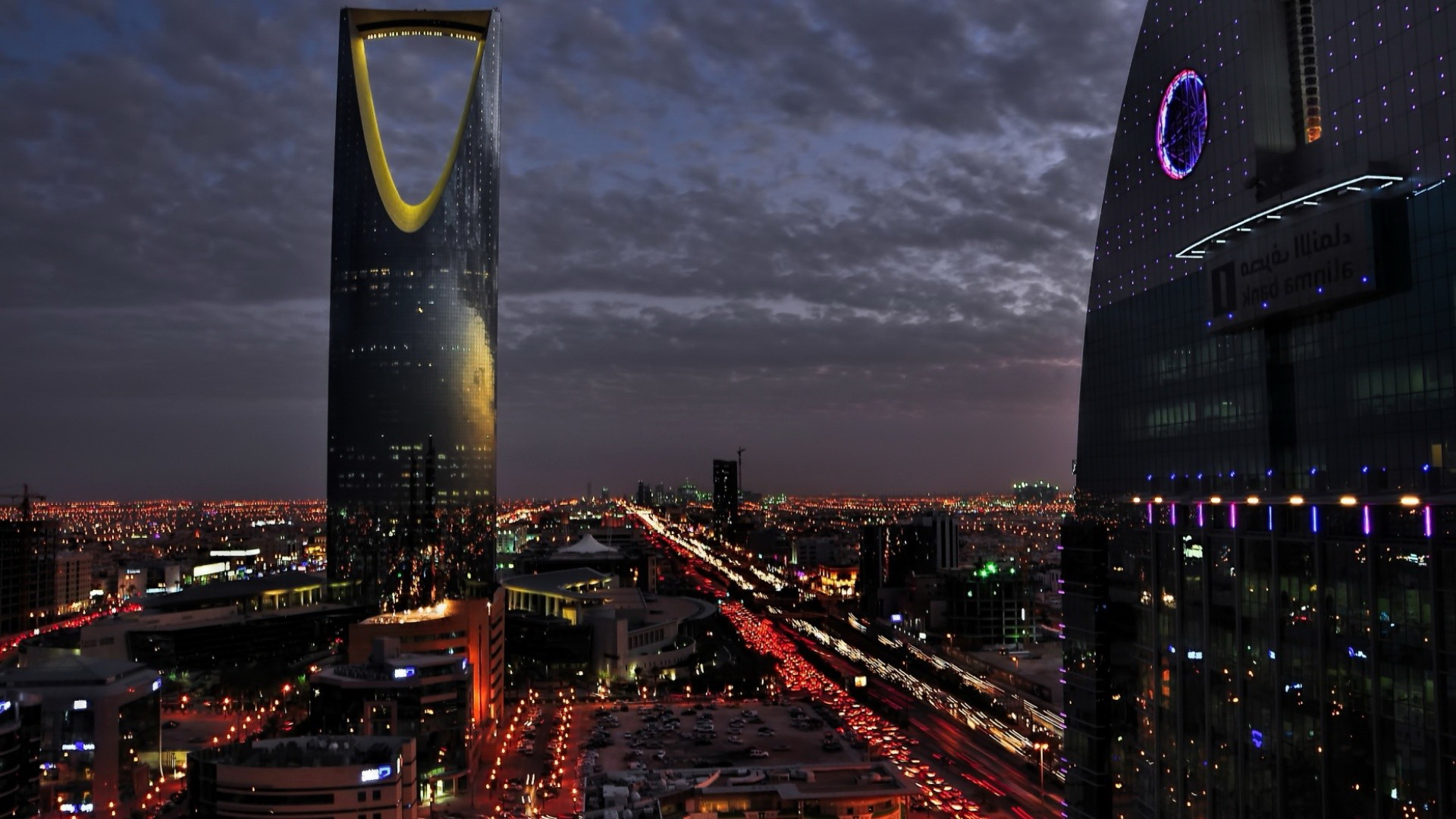 Description: A city skyline with a very tall building in the middle of it at night time with traffic on the street.