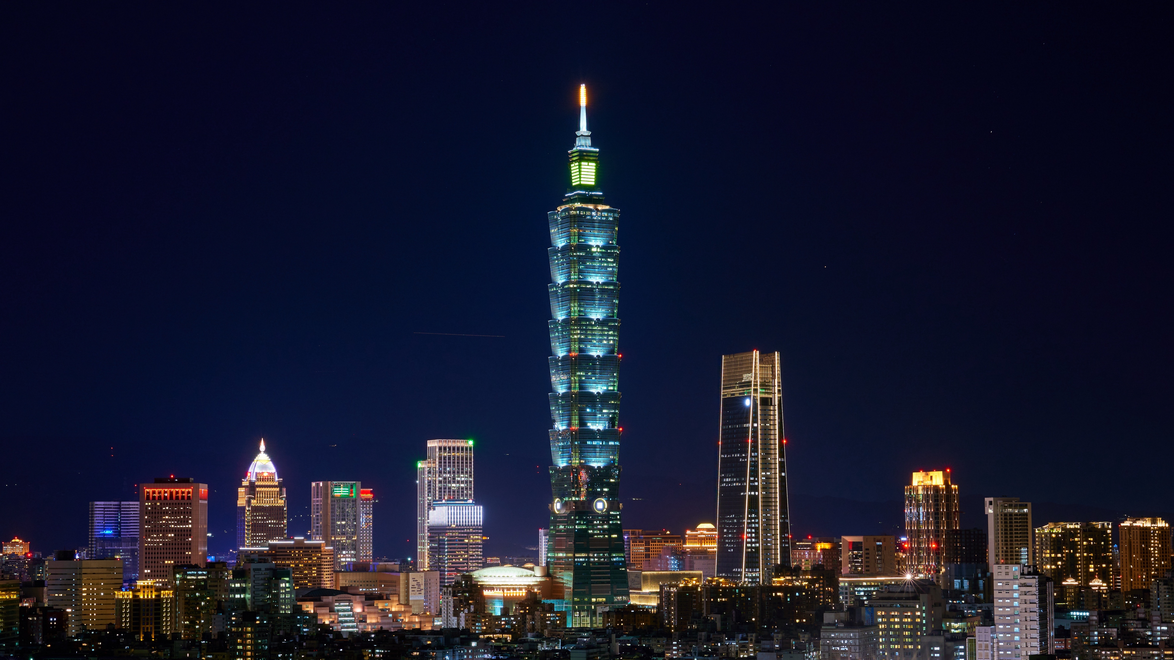 Description: A city skyline with a tall building lit up at night time with a lot of lights on it and a few buildings in the background.