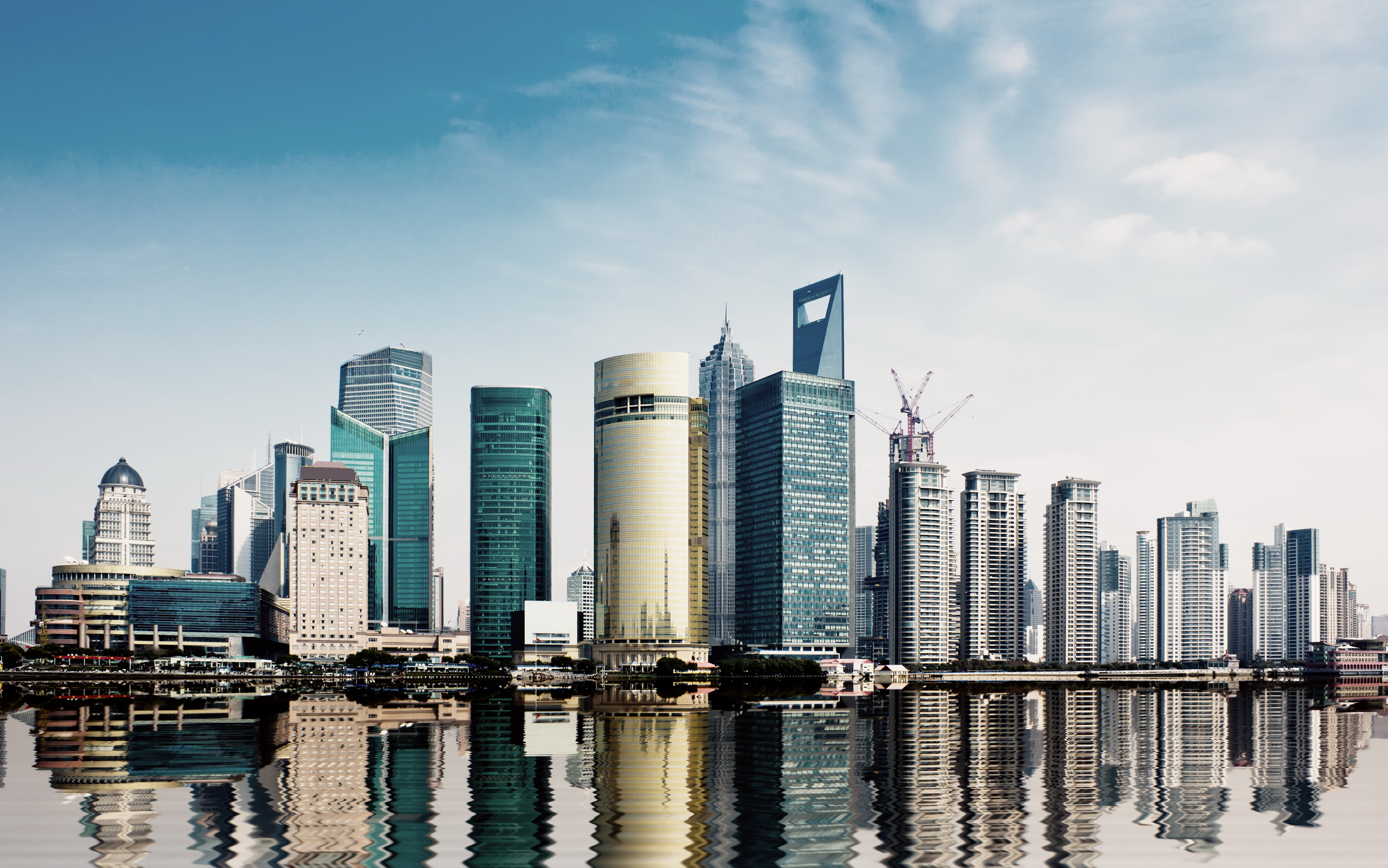 Description: A city skyline with a body of water in front of it and a few buildings in the background with a blue sky.
