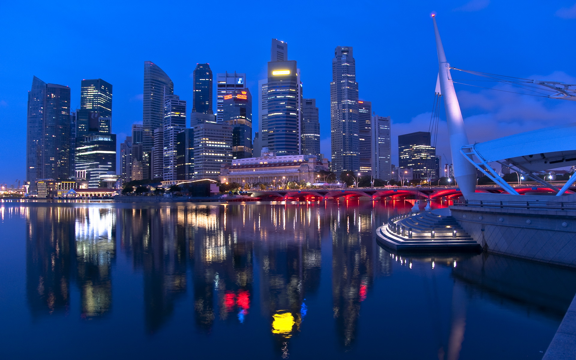 Description: A city skyline with a body of water and a boat in the foreground at night time with a bright yellow light.