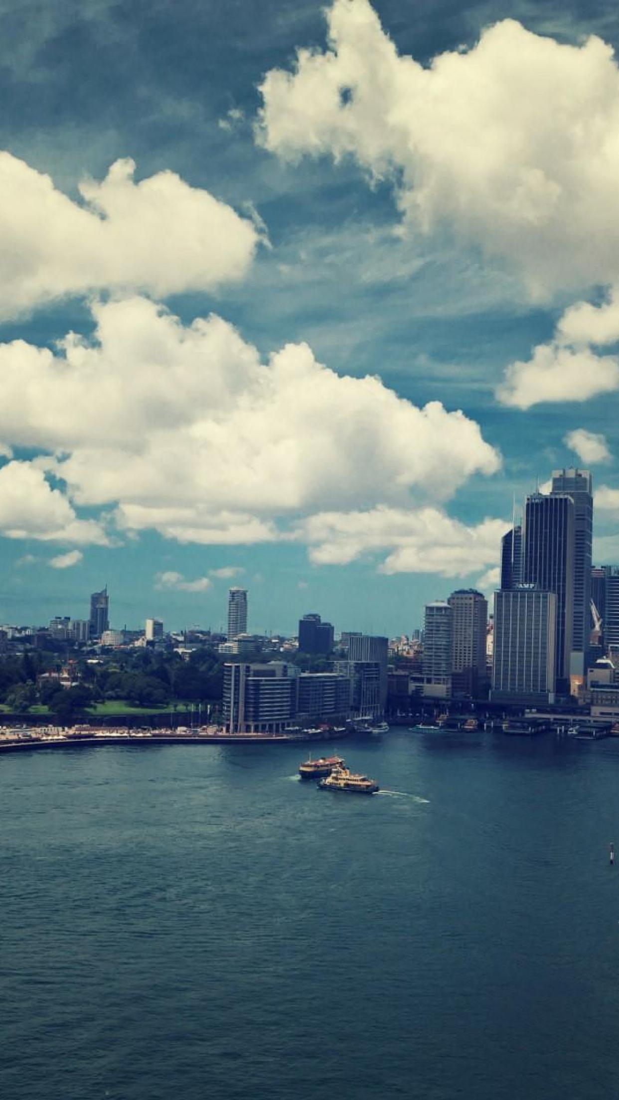 Description: A city skyline with a body of water in front of it and a boat in the water in front of it.