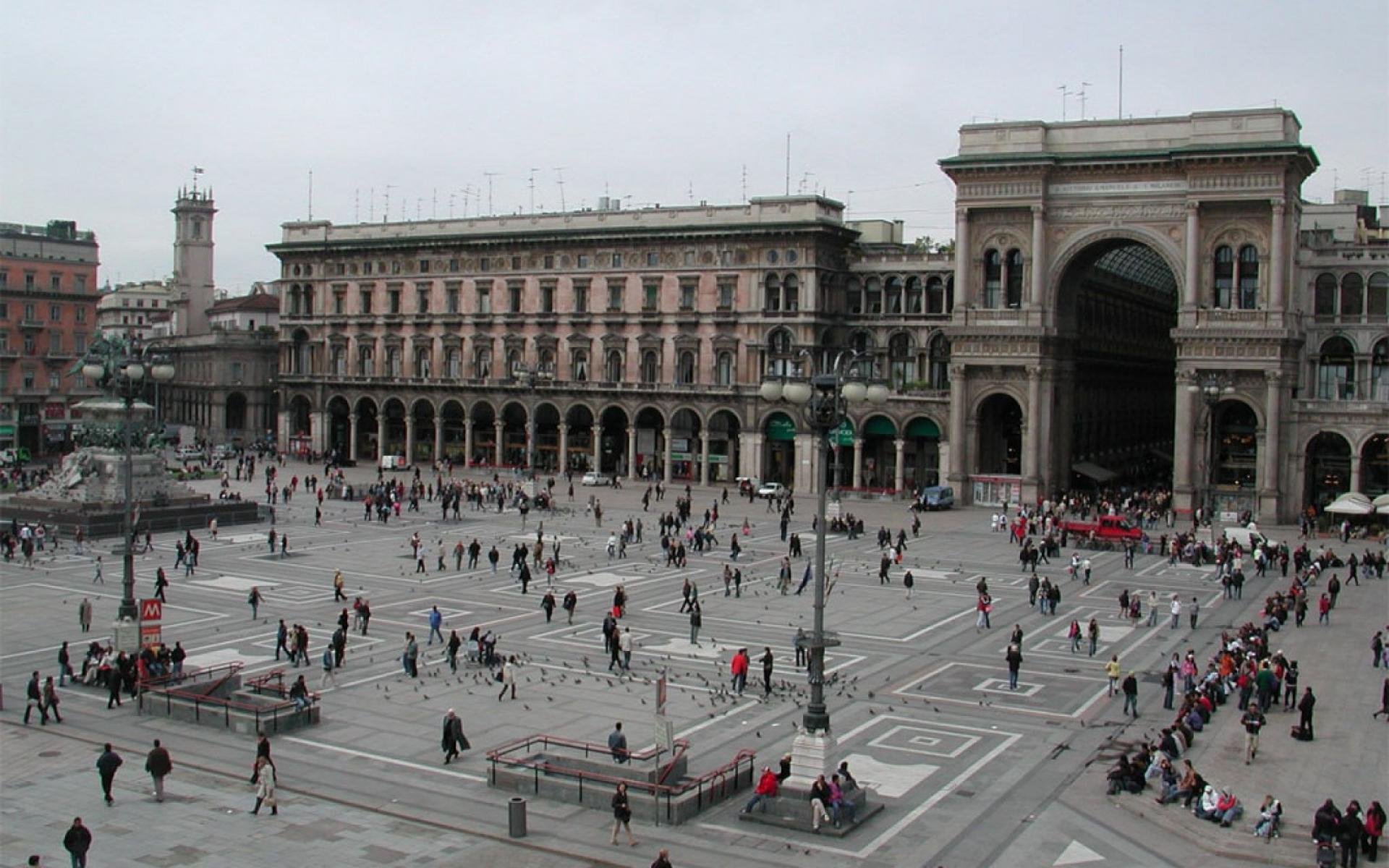 Description: A large group of people standing around a plaza in a city square with a clock tower in the background.