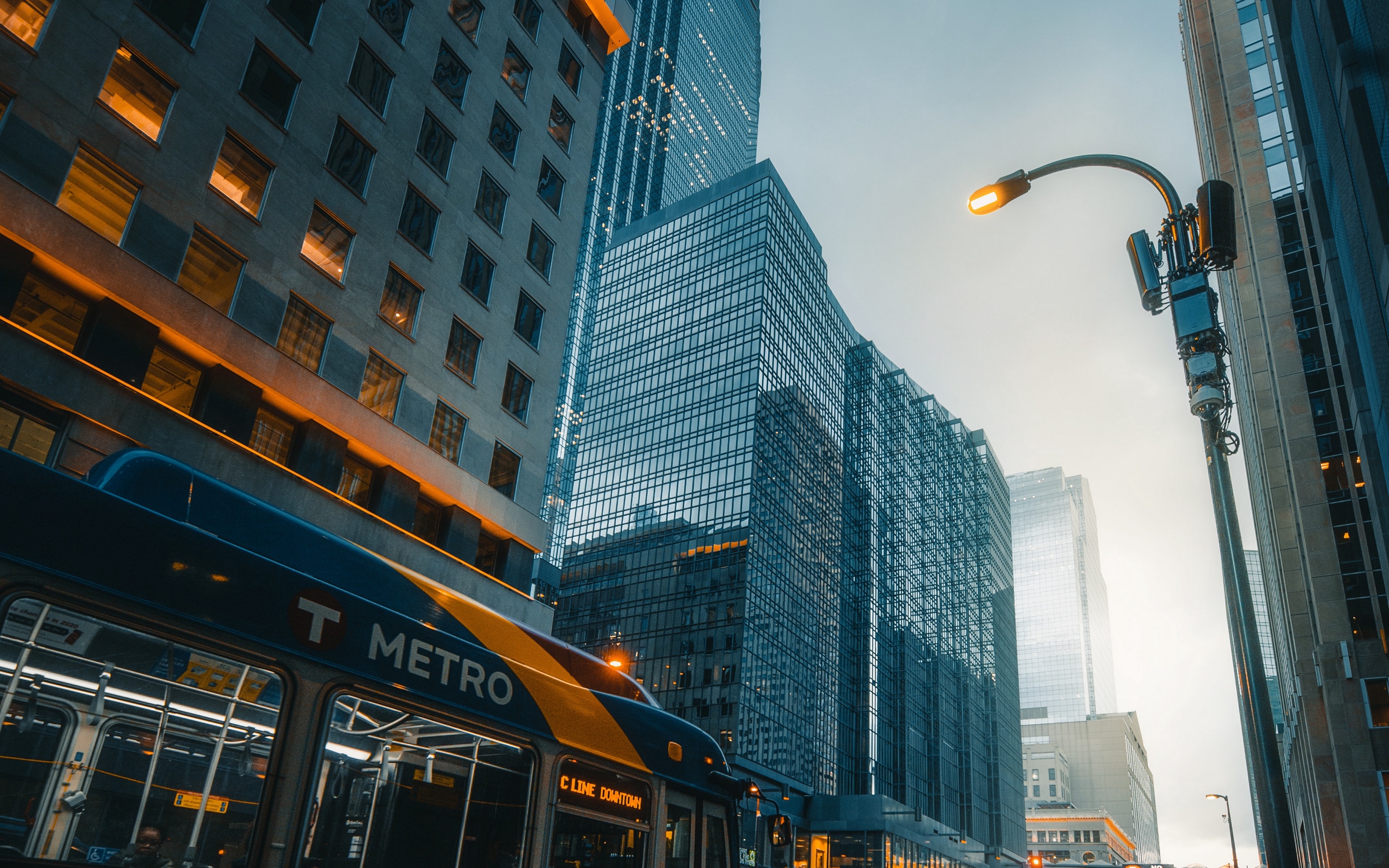 Description: A city street with a bus and a traffic light in the foreground and a tall building in the background.