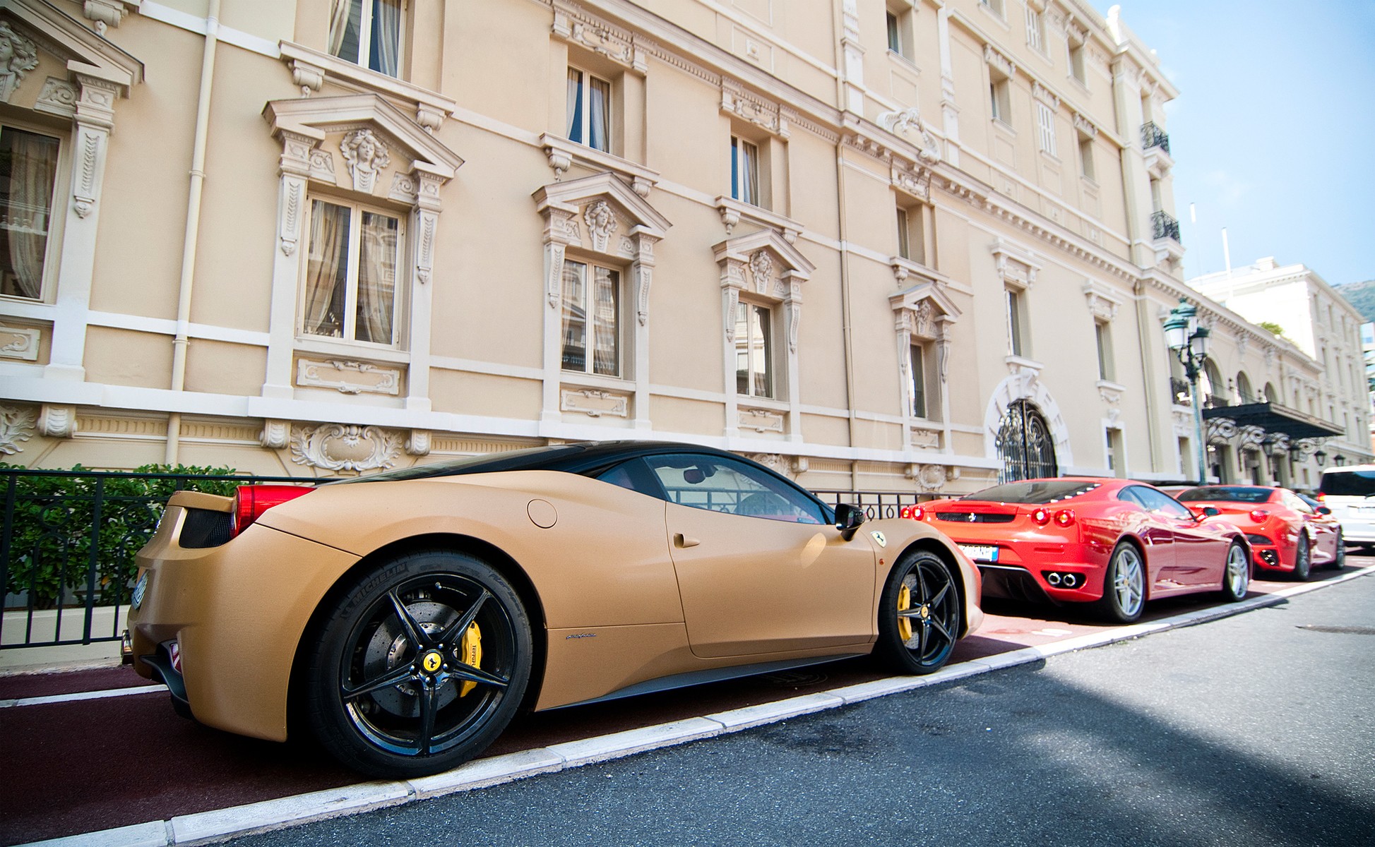 Description: A row of cars parked on the side of a street next to a building with a statue on the side of the street.