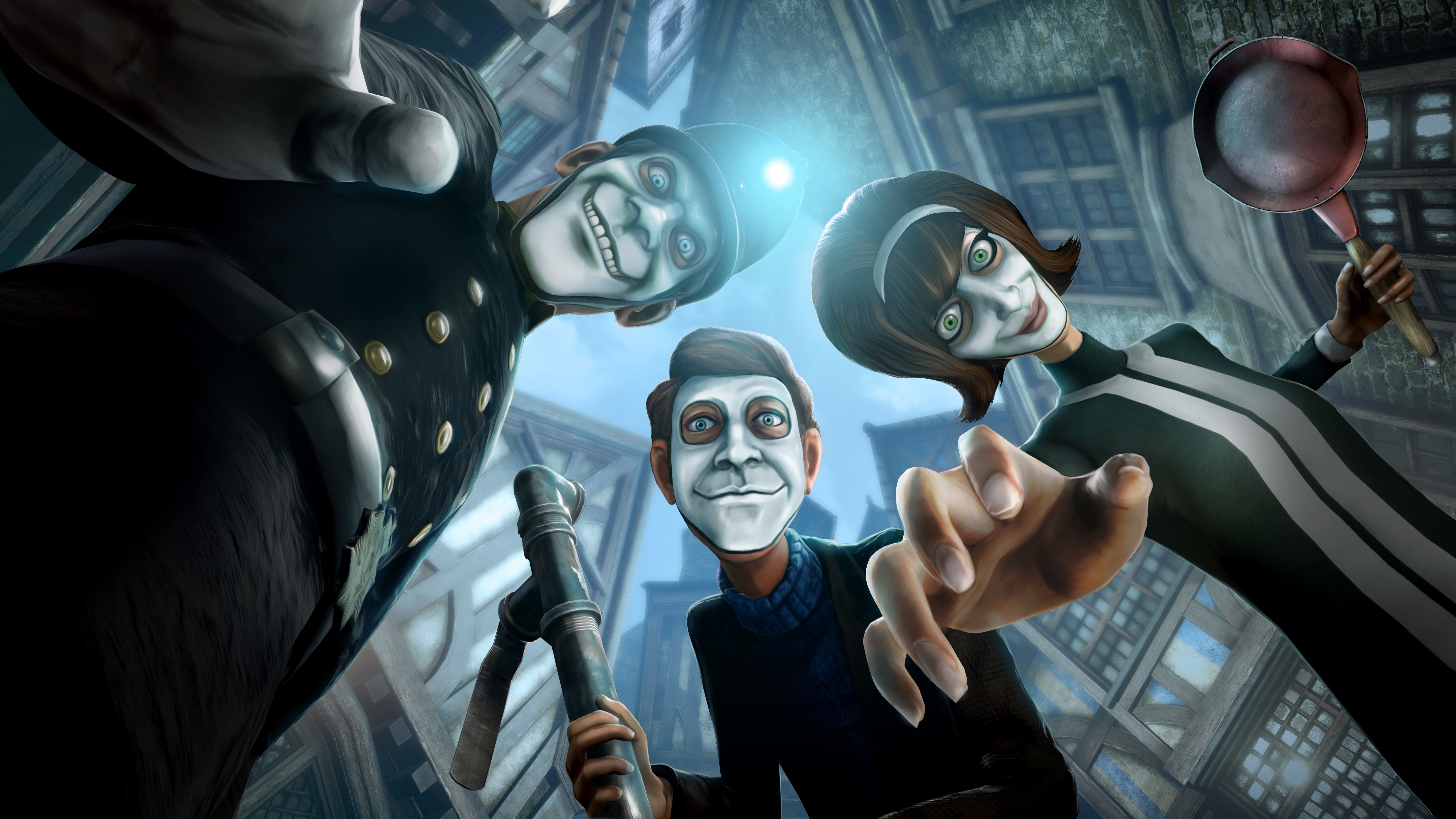 Description: A group of people with painted faces and masks on holding tennis rackets in a city street at night.