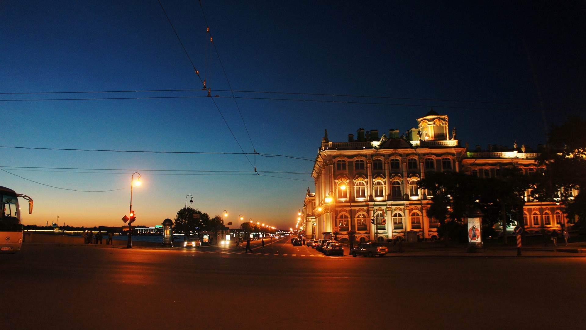 Description: A city street at night with a bus and a building in the background with lights on it and a street light in the foreground.