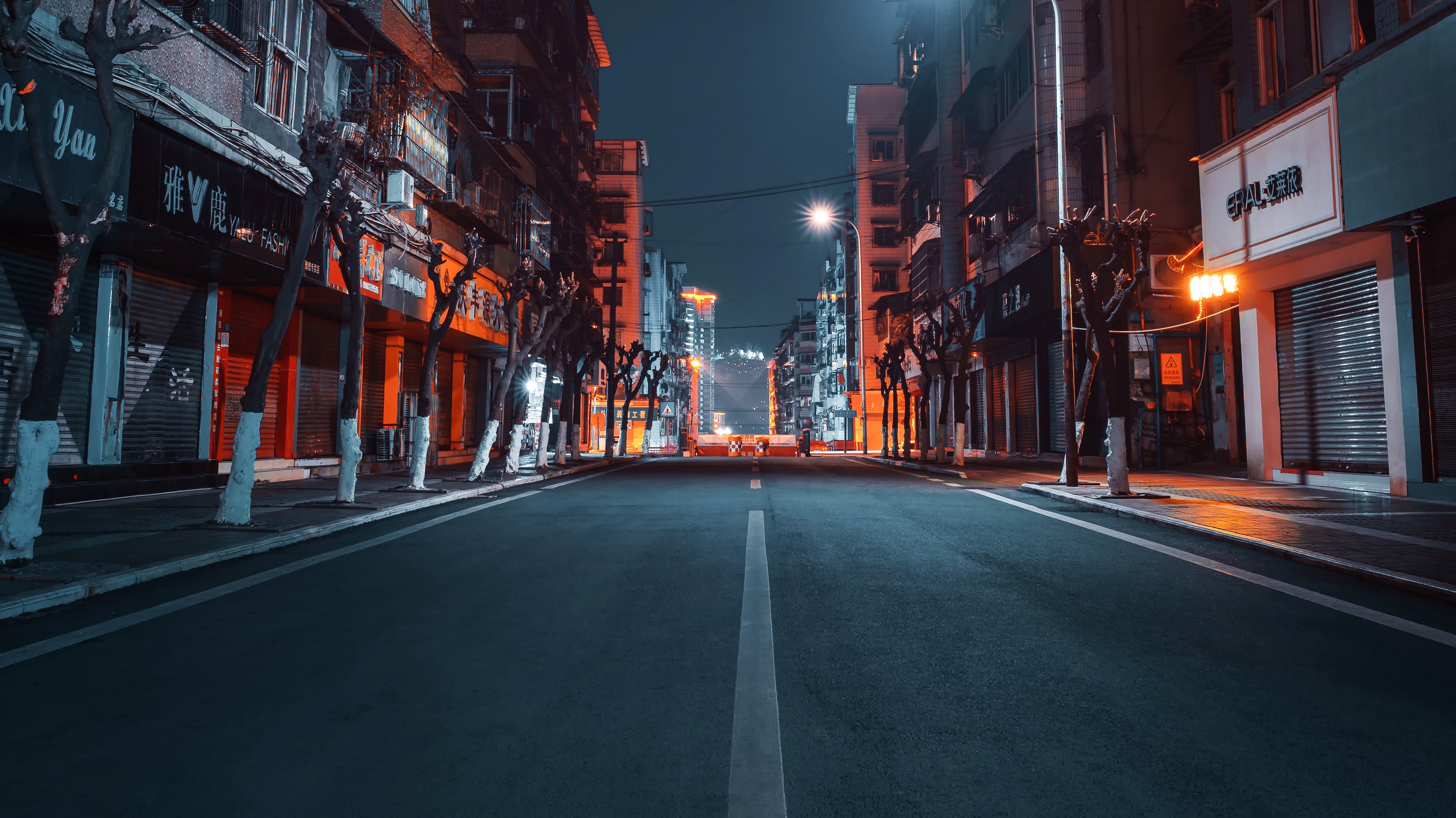 Description: A city street at night with a street light on and buildings on both sides of the street and a street sign on the side of the street.