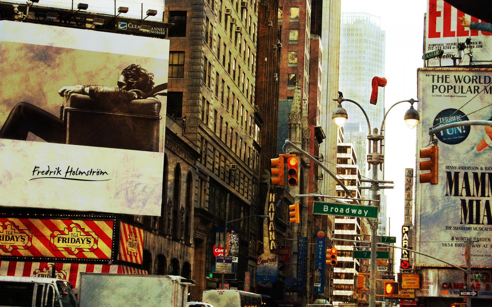 Description: A city street with a lot of signs and traffic lights and buildings in the background and a billboard on the side of the street.