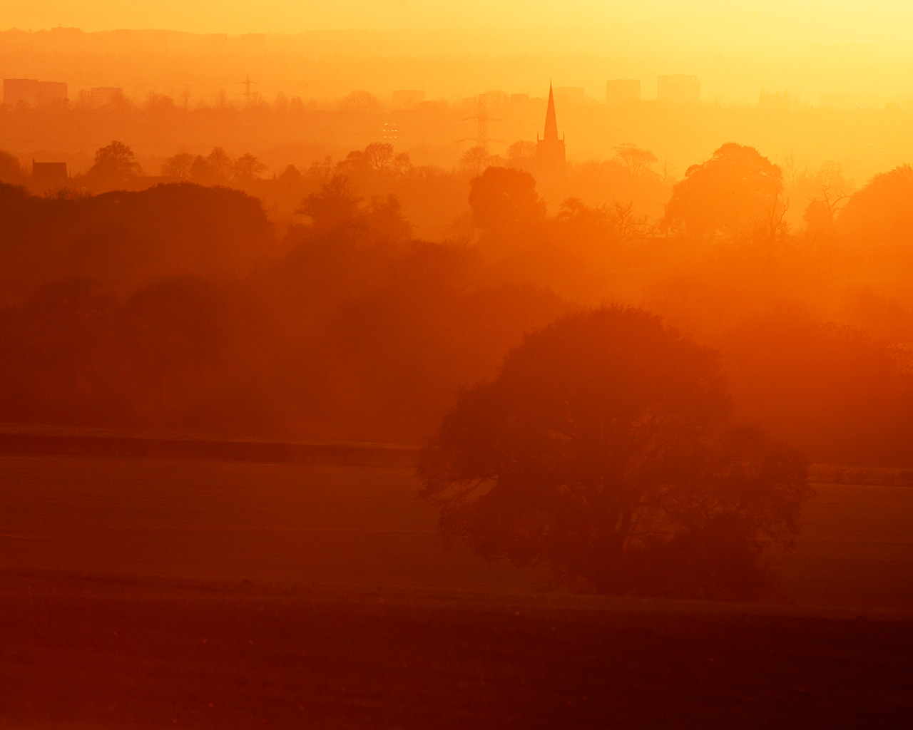 Description: A view of a city with a sunset in the background and a horse grazing in the foreground with a distant city in the distance.
