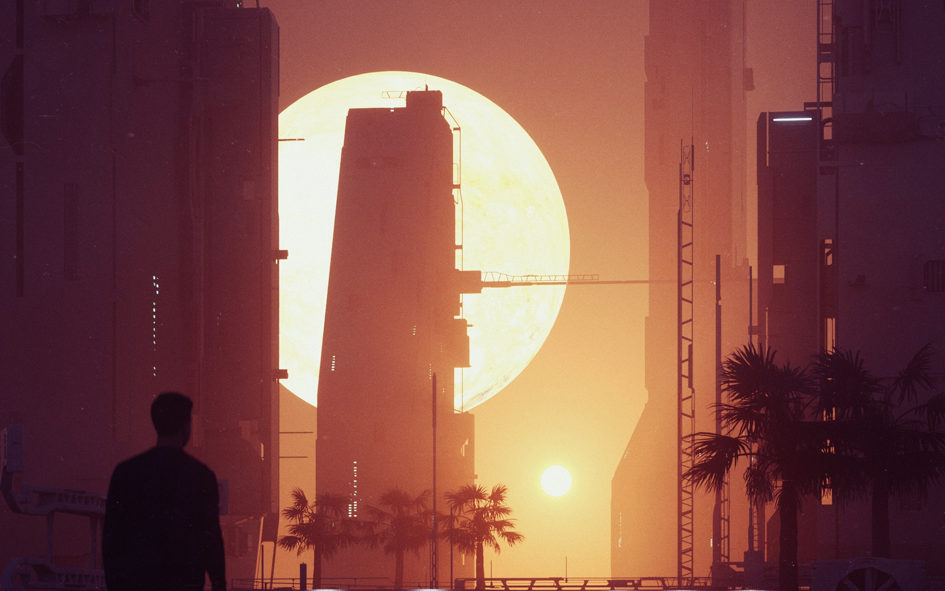 Description: A man standing in front of a city skyline at sunset with the sun setting in the background and a large building in the foreground.
