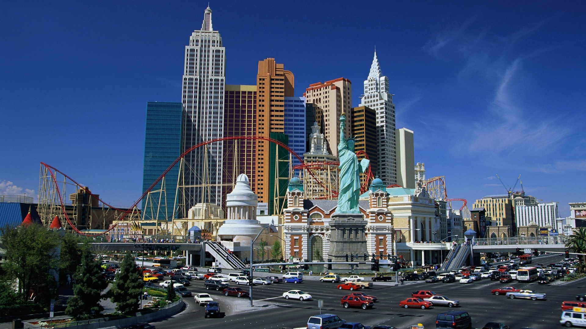 Description: A city with a lot of tall buildings and cars driving down the street in front of them and a bridge in the middle.